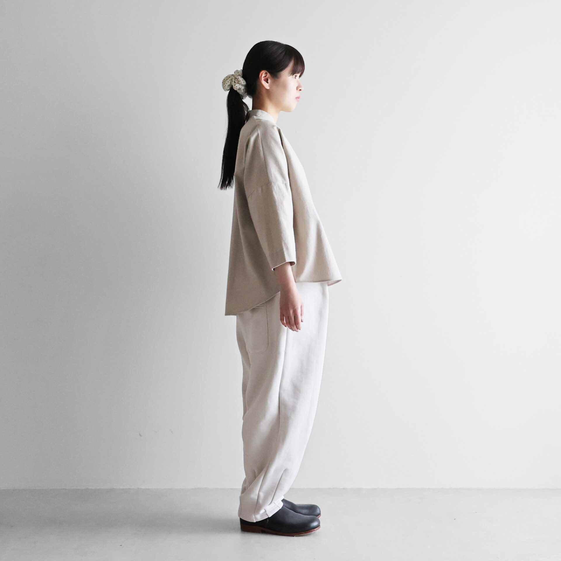 もも周りにたっぷりと生地を使用したバルーンパンツで、裾に向けてテーパードがかかったきれいなラインのシルエットです。定番のバルーンパンツのフルレングス版で、少しロールアップして履いていただくと調整がしやすい丈感。男性の方にもおすすめです。右後ろについた下がり気味のポケットがポイント。