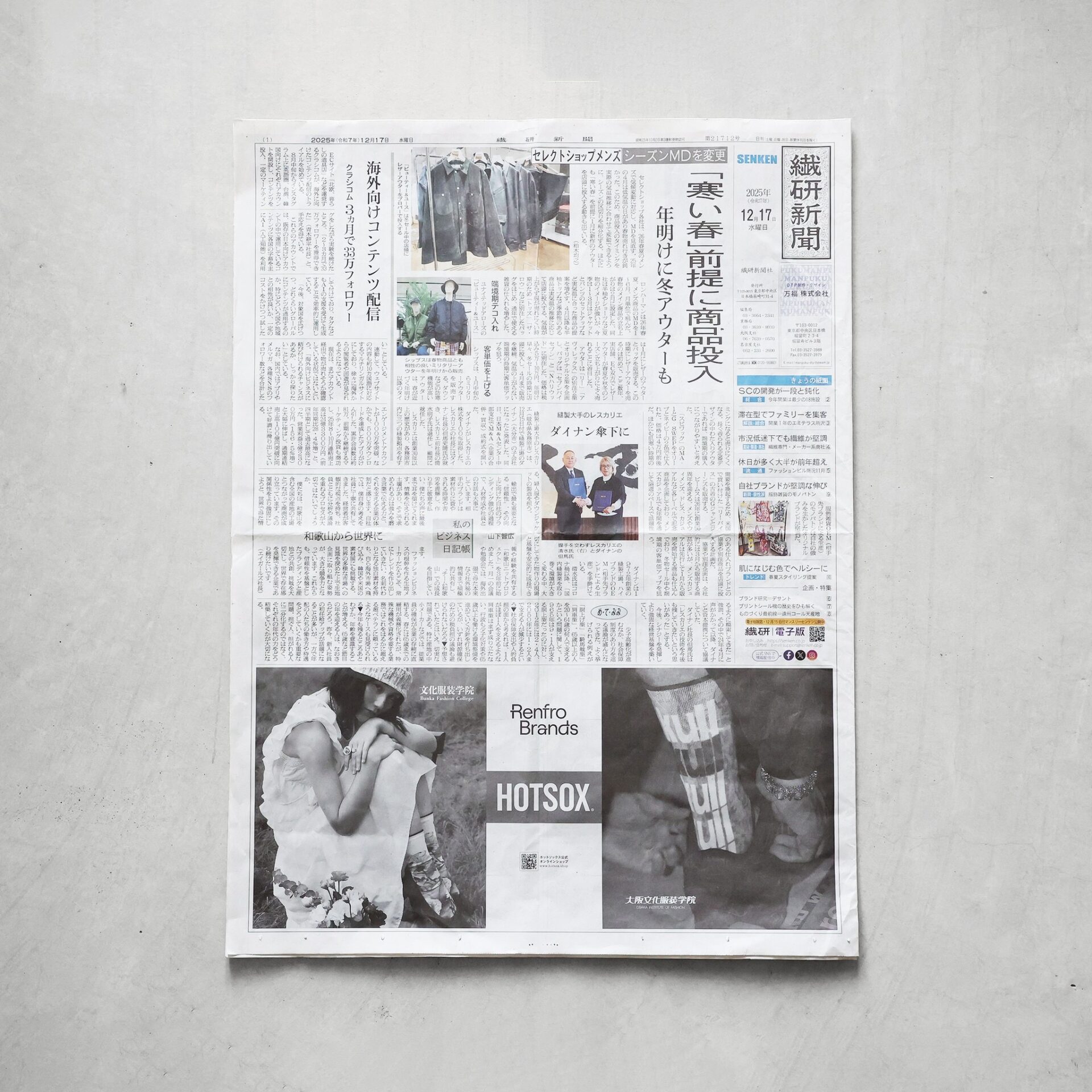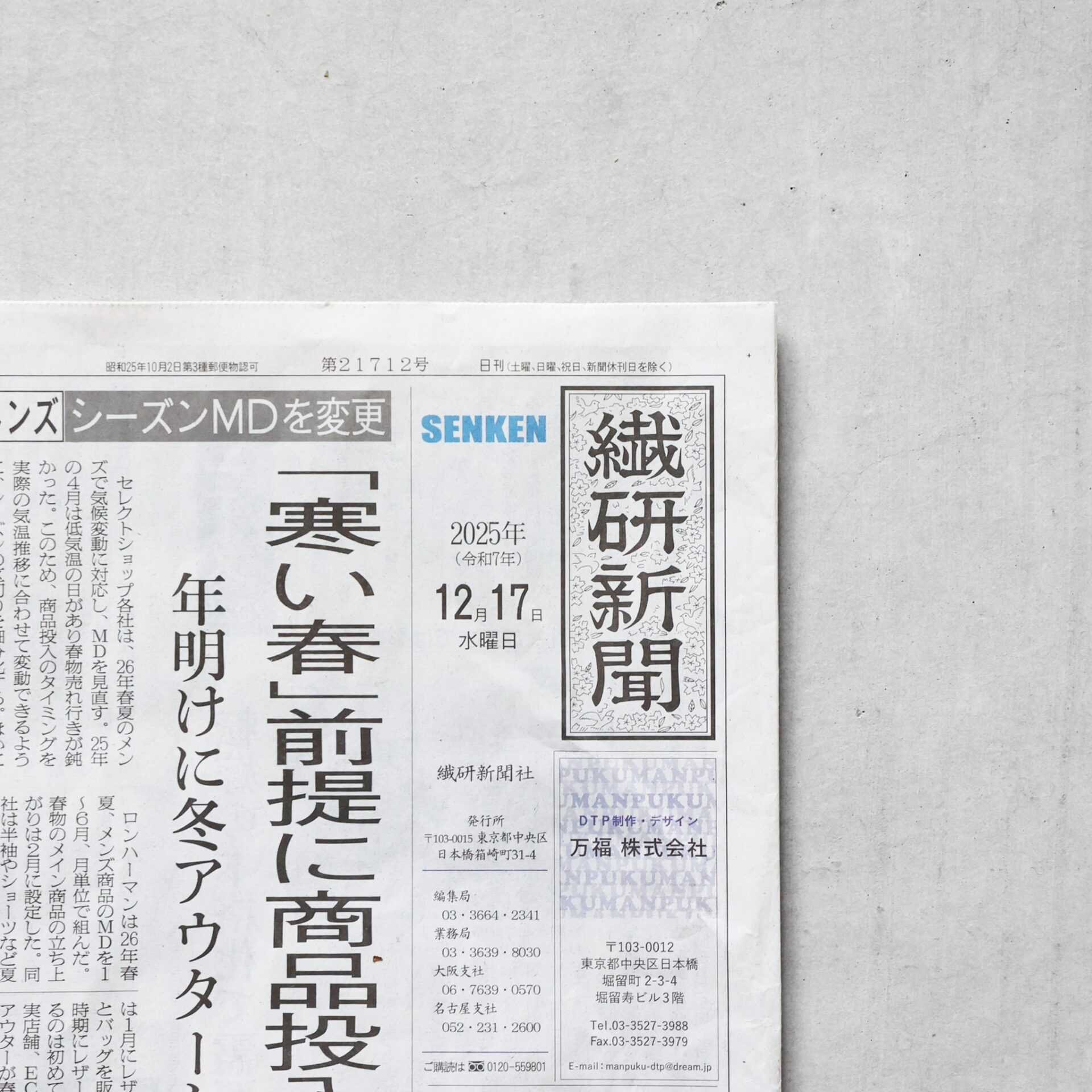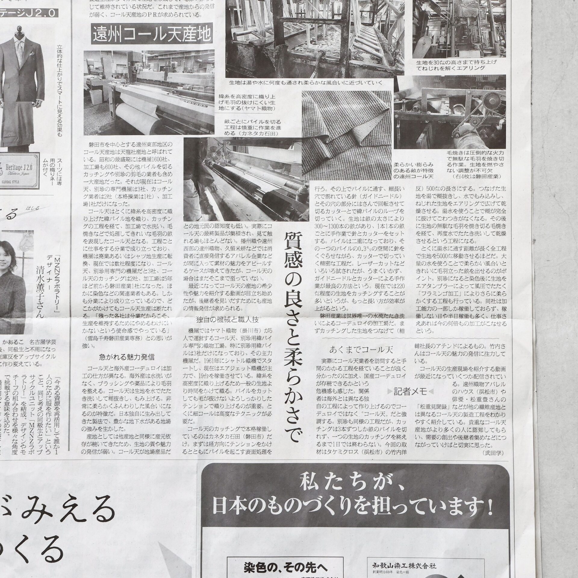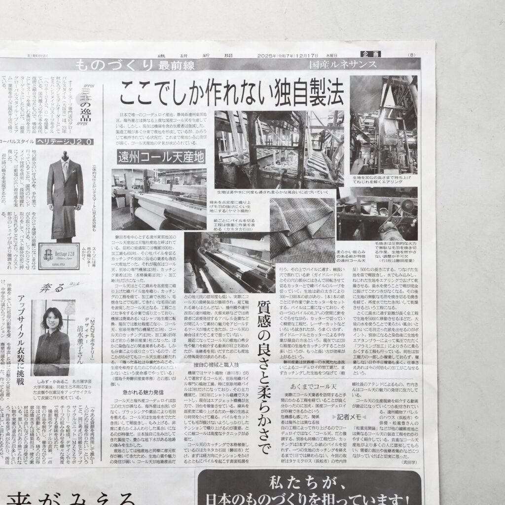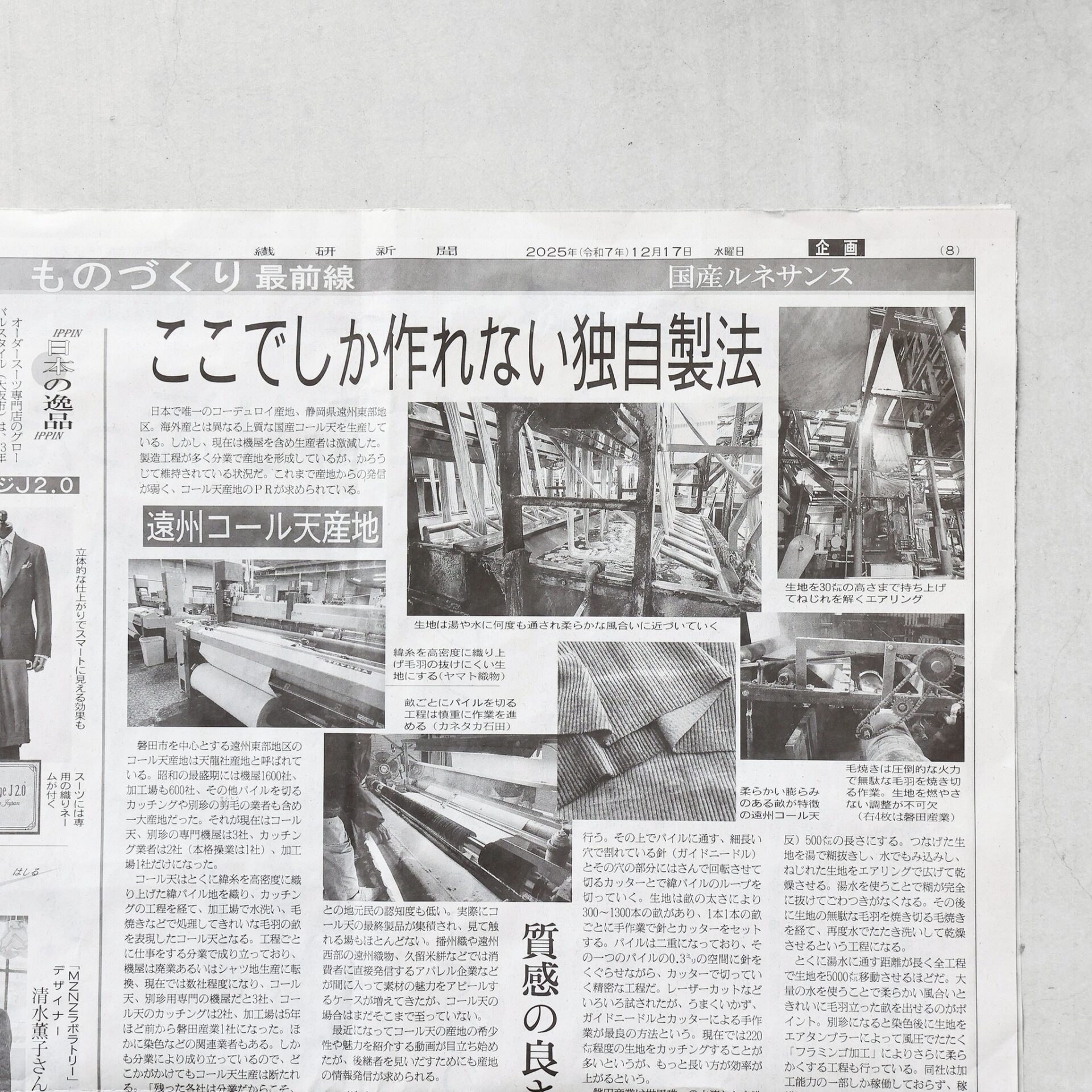 日本で唯一のコーデュロイ(コール天)産地・遠州の製造背景から現場の声まで、11/28のコール天の記事に引き続き12/17付の繊研新聞にて丁寧に取材・掲載していただきました。