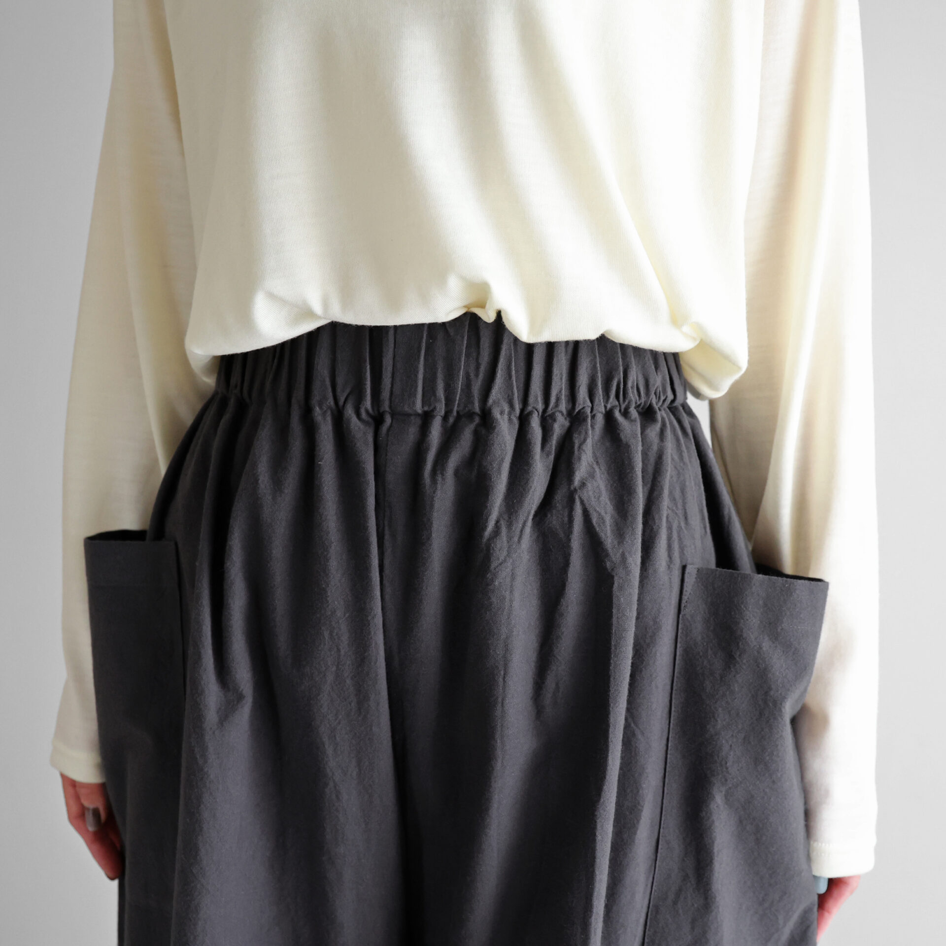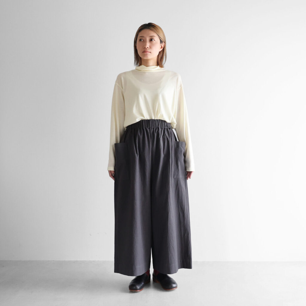 サイドに配したポケットがさりげないアクセントになり、生地の落ち感が美しく、上品な印象を引き立てます。