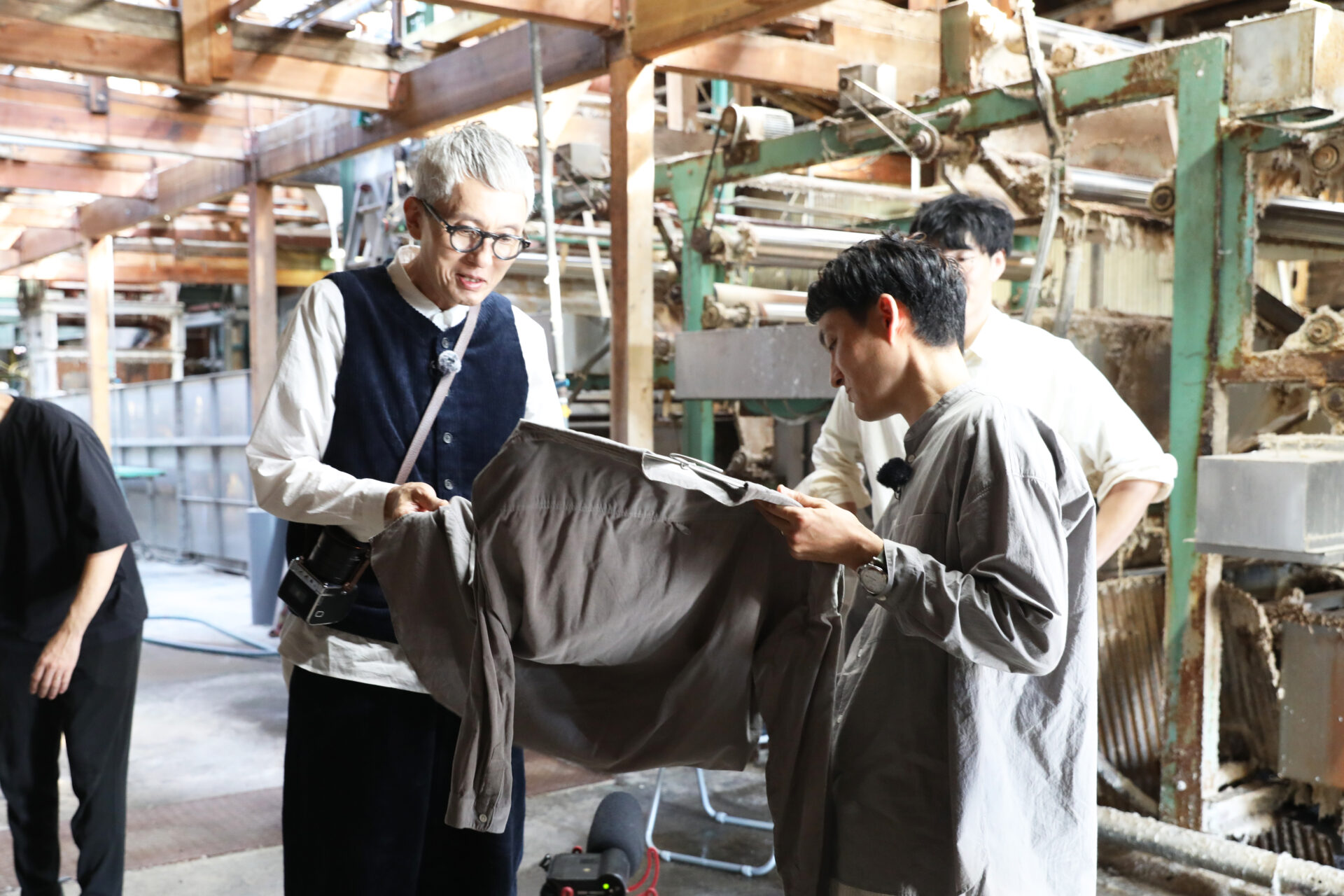 洋服や音楽にも深い造形をお持ちで知られている松重豊さんですが、ものづくりにも精通されていて、工場取材の際にはお仕事を忘れたかのように設備の隅々までご覧になり、気になること、知りたいことはひとつひとつ質問され、ご自身のフィルムにその様子を収めていらっしゃいました。