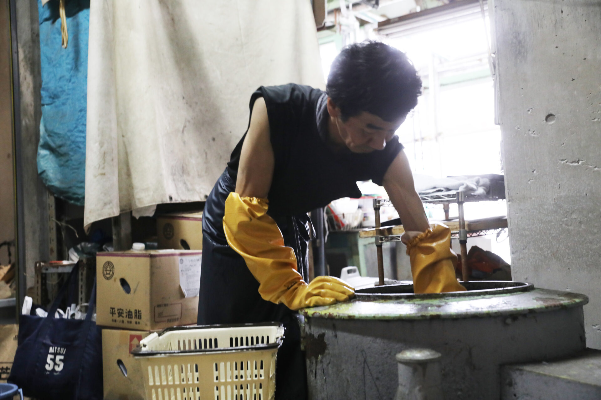 イベント会場では、スタッフが長年愛用したHUISアイテムの染め替え後の仕上がりや風合いもお楽しみいただけなら、山勝染工さんが生み出す特別な「黒」を味わっていただけます。