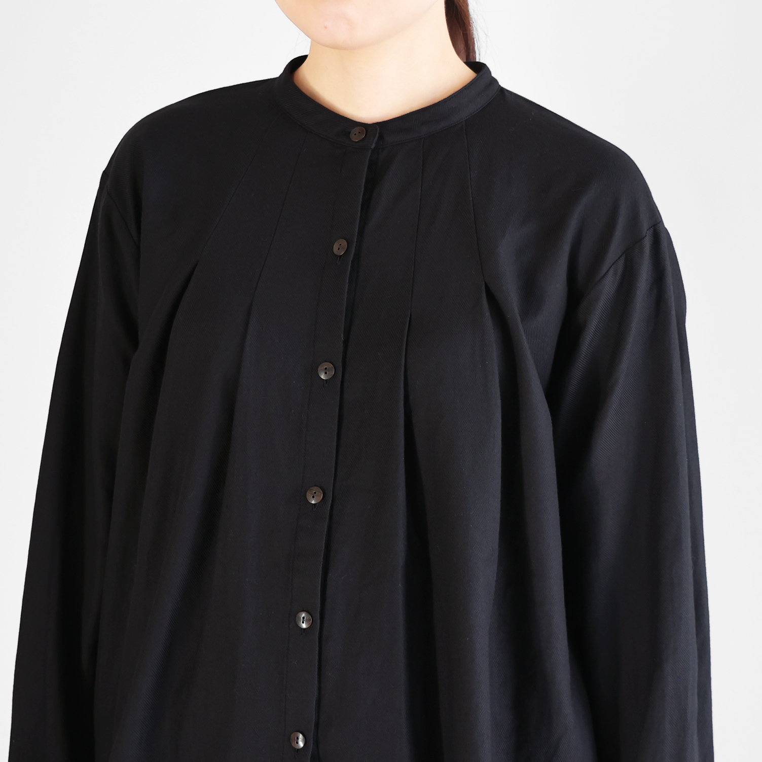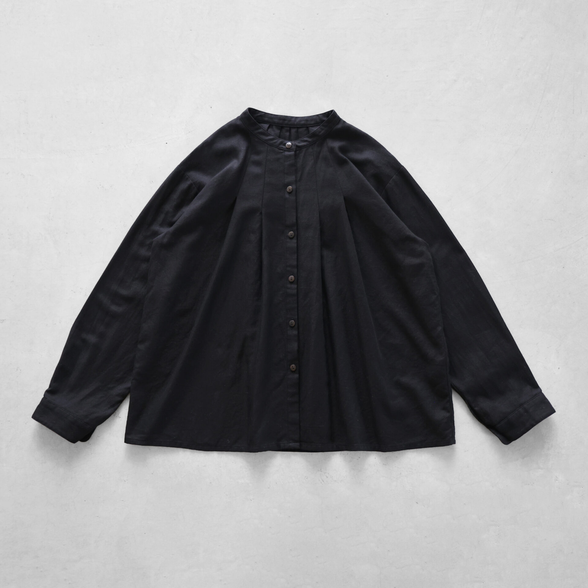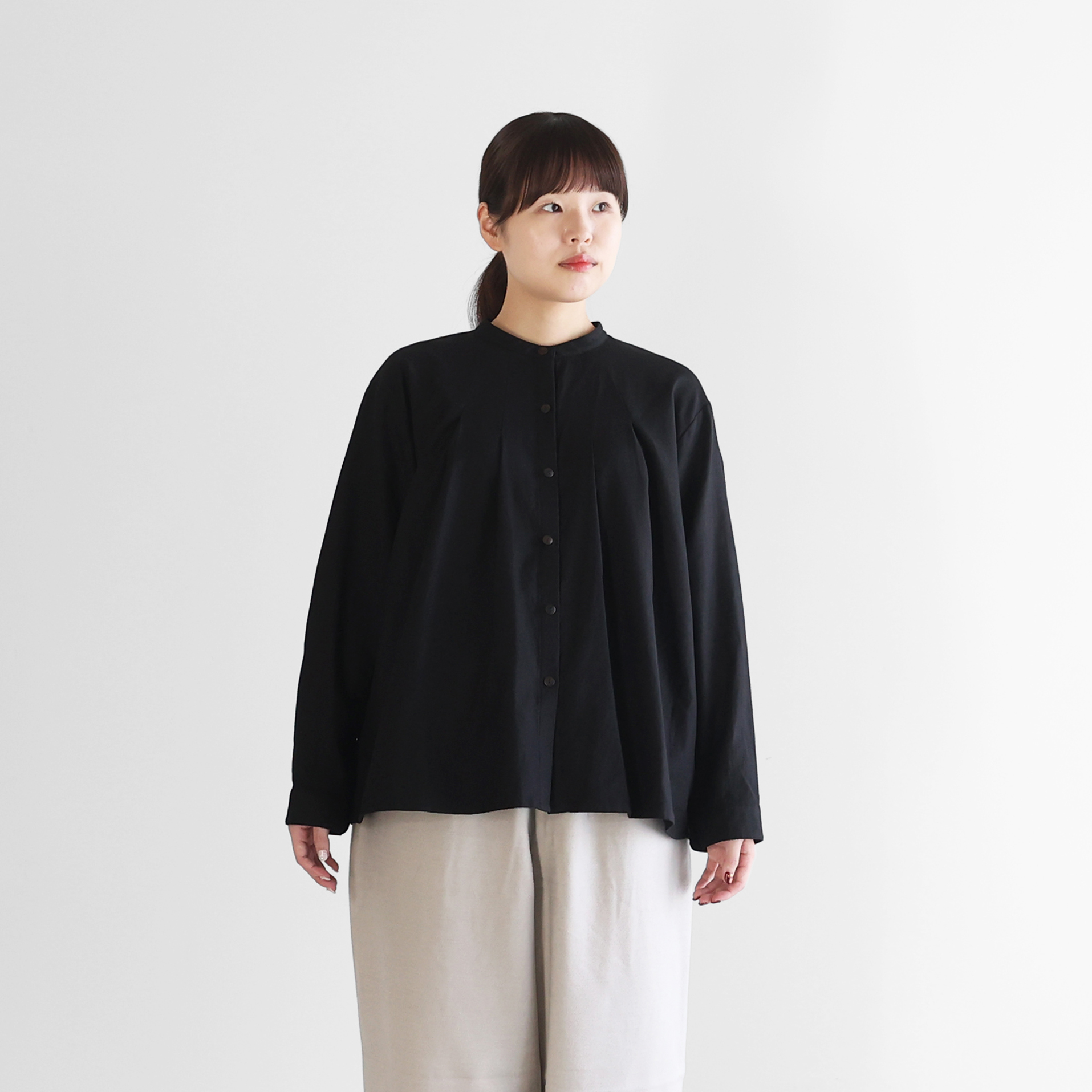デザインは、シンプルなバンドカラーブラウスで、首周りにタックが入った仕様のため、身幅がたっぷりととられ贅沢に生地を使用した豊かなシルエットが特徴です。後ろの首元にもタックがあしらわれ、エレガントな雰囲気がありながらやわらかな素材感とシルエットの HUIS らしいブラウスに仕立てられています。