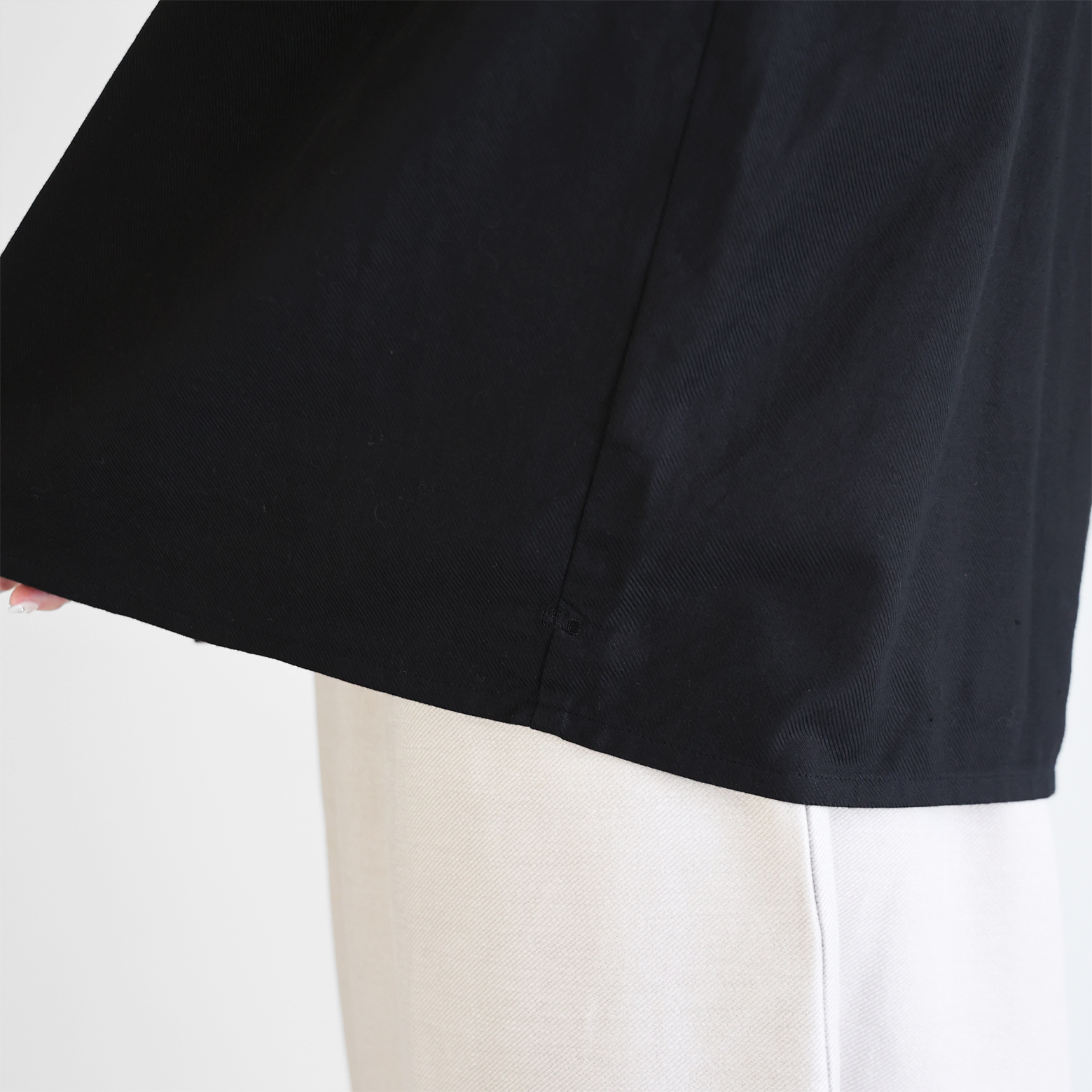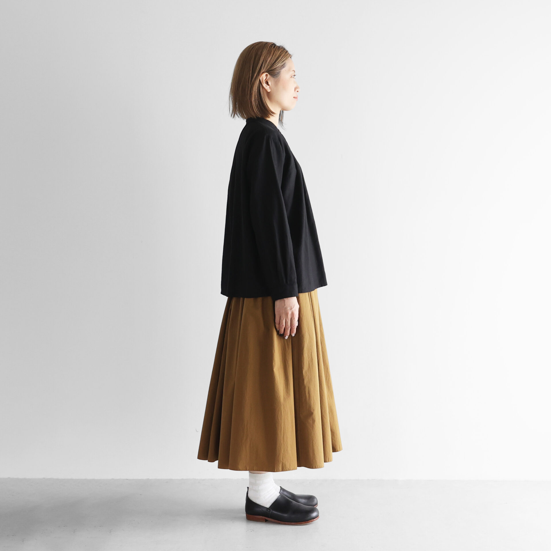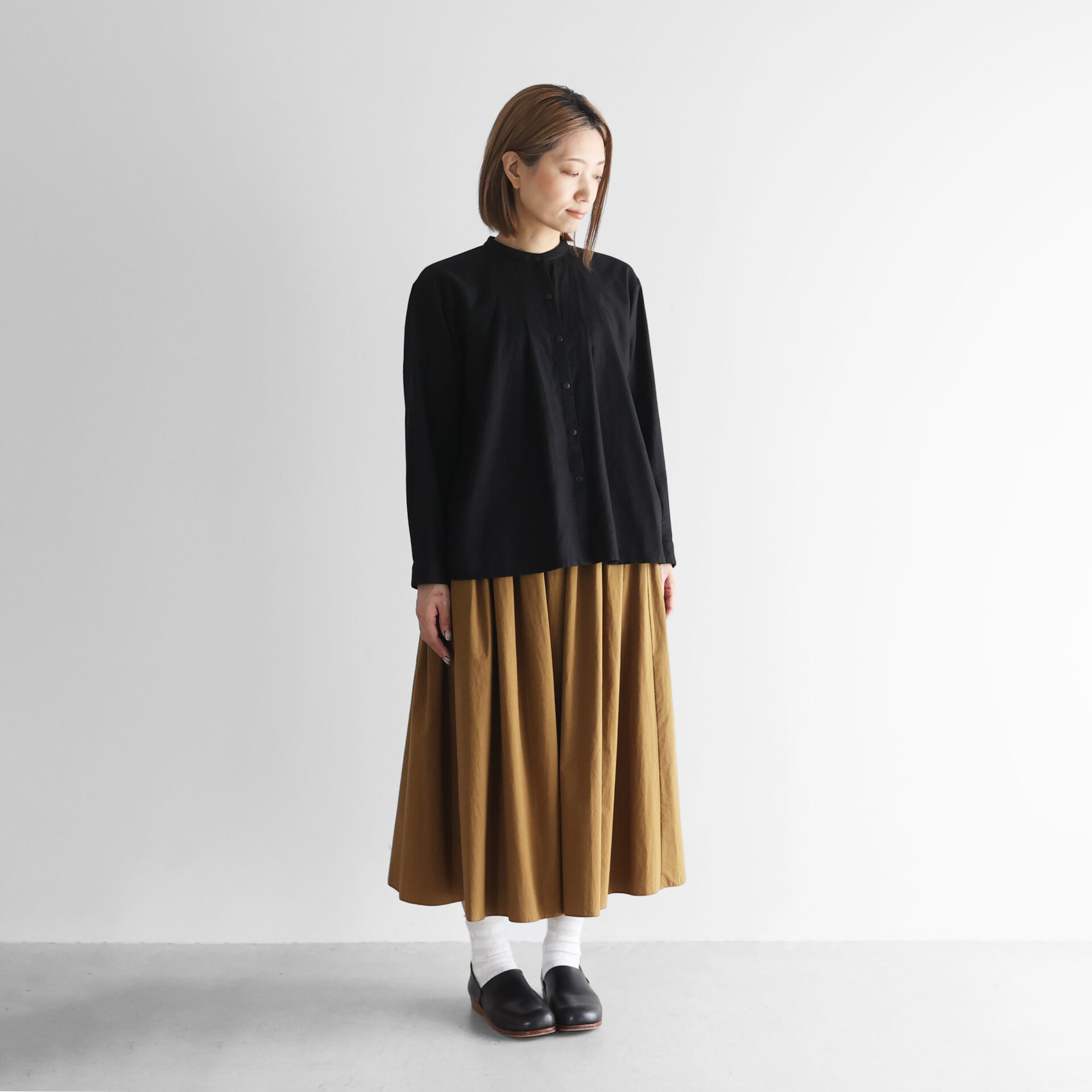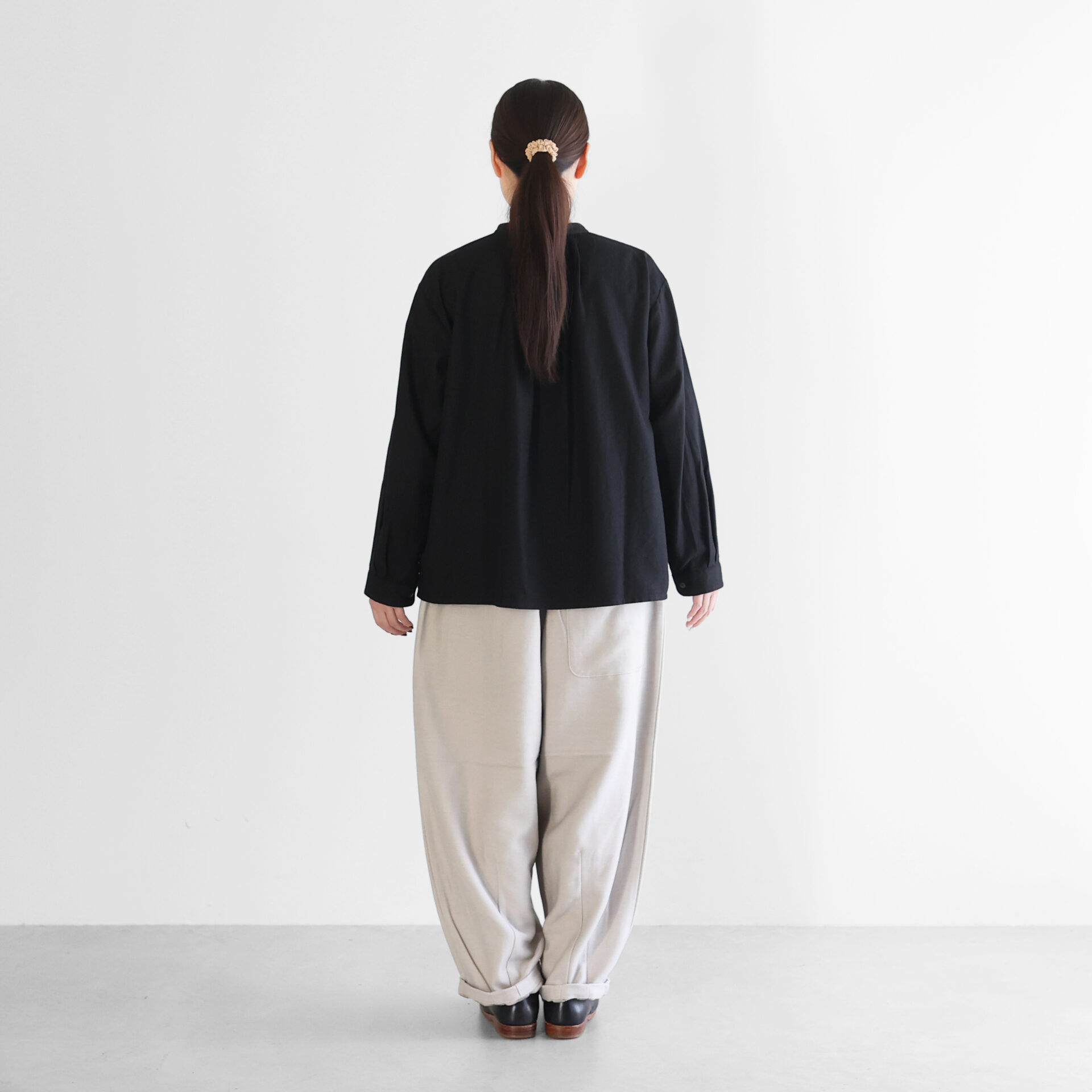 デザインは、シンプルなバンドカラーブラウスで、首周りにタックが入った仕様のため、身幅がたっぷりととられ贅沢に生地を使用した豊かなシルエットが特徴です。後ろの首元にもタックがあしらわれ、エレガントな雰囲気がありながらやわらかな素材感とシルエットの HUIS らしいブラウスに仕立てられています。