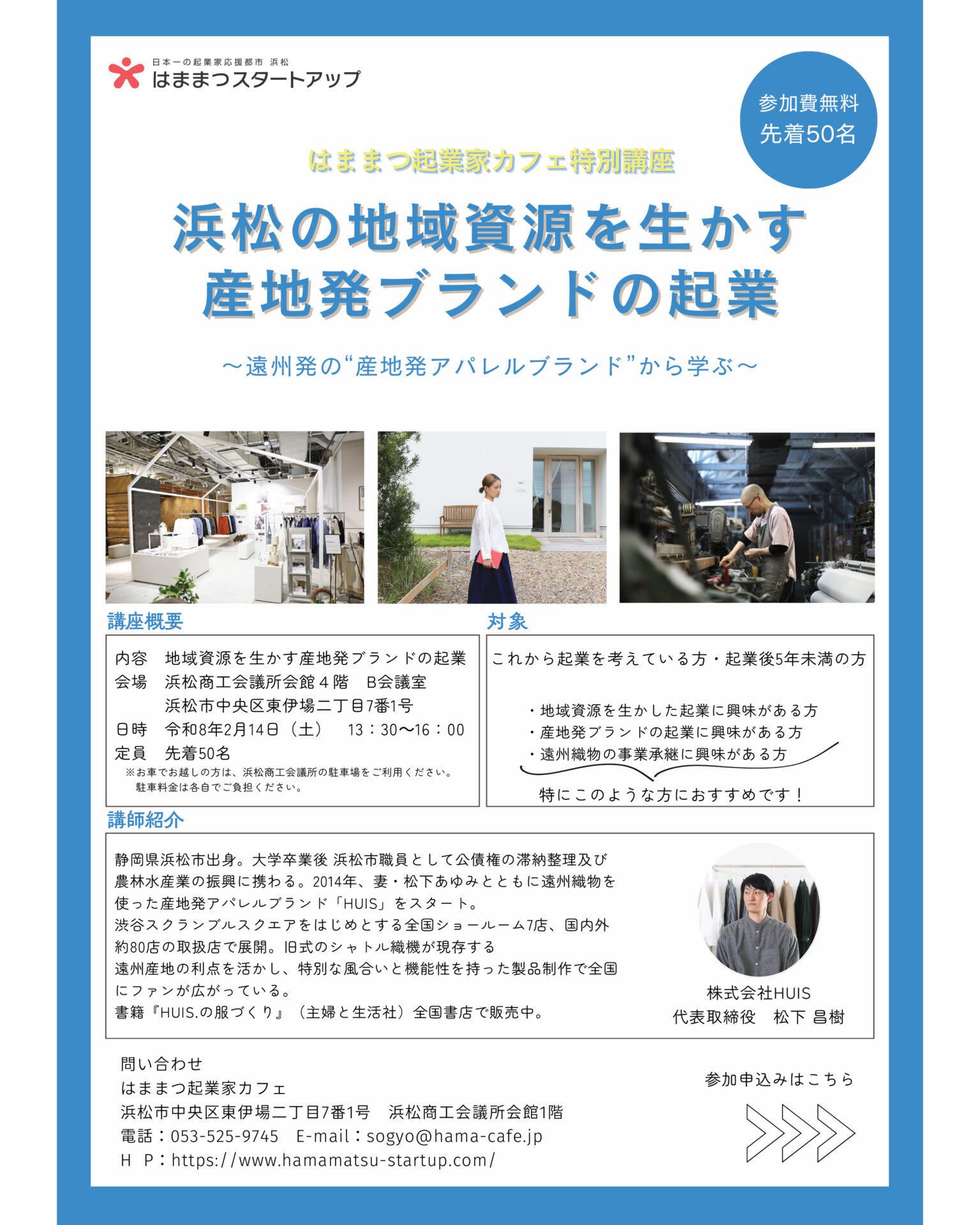 2/14(土)13:30より開催されるはままつ起業家カフェ主催の特別講座「浜松の地域資源を生かす産地発ブランドの起業」の講師としてお声がけいただき、HUIS代表松下が登壇させていただきます。