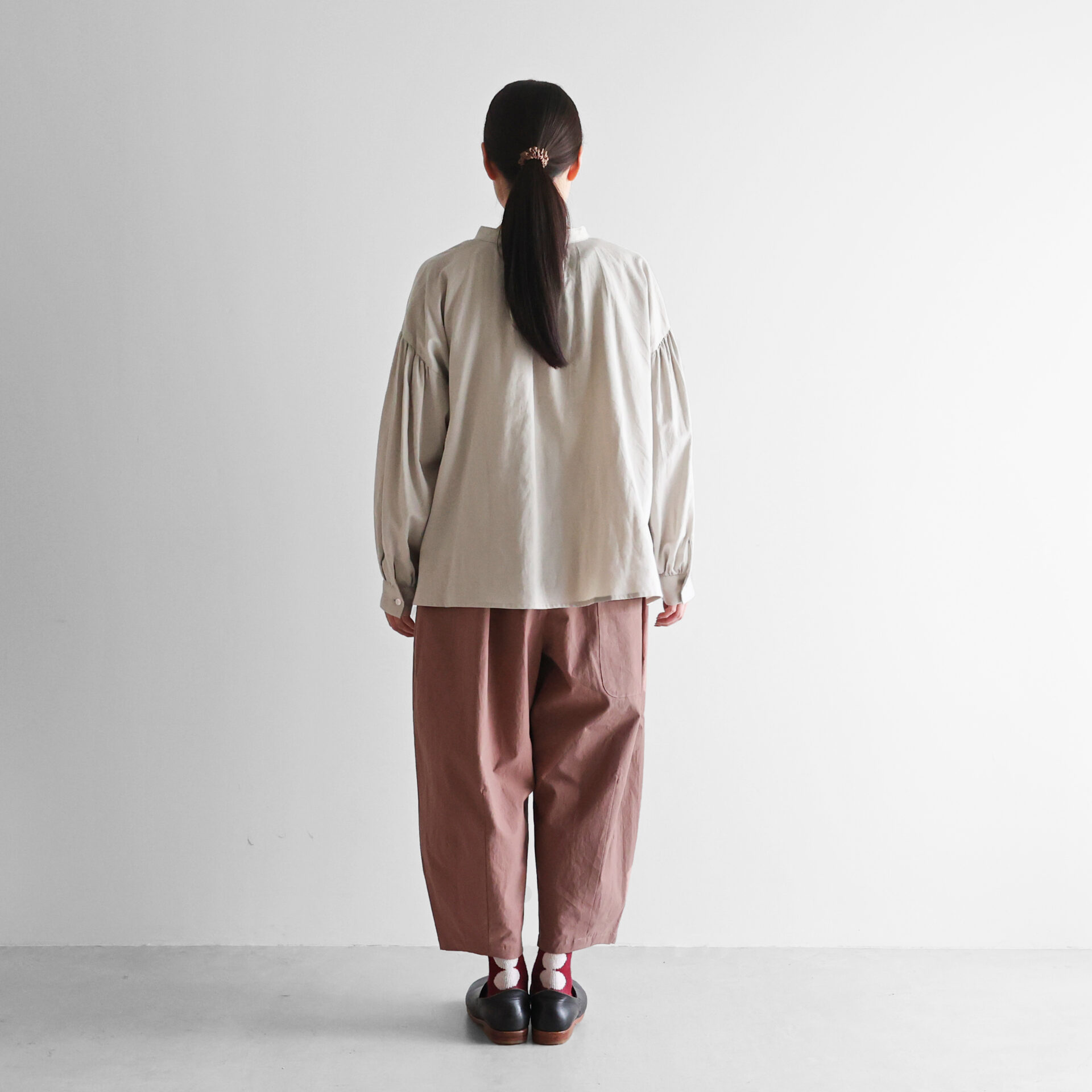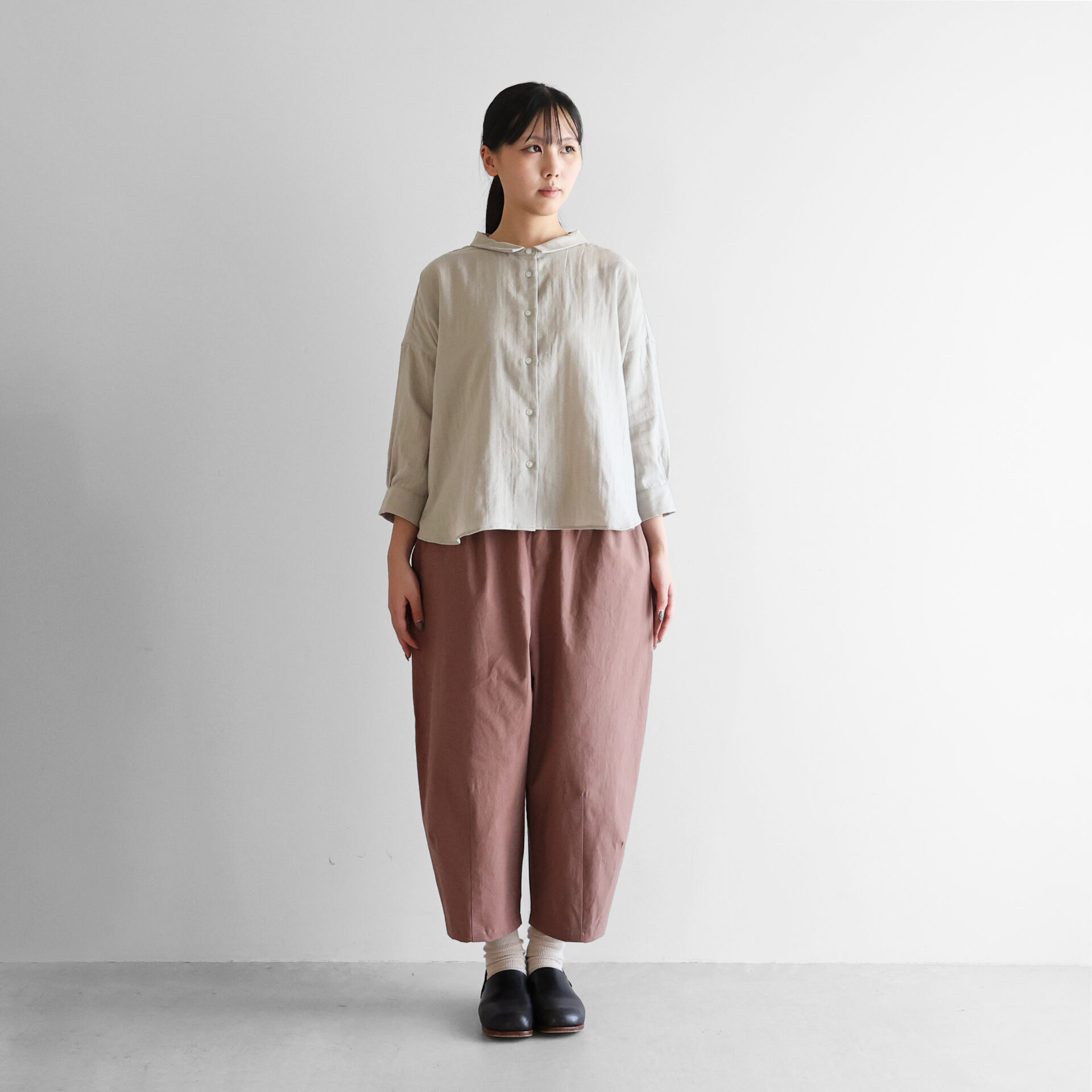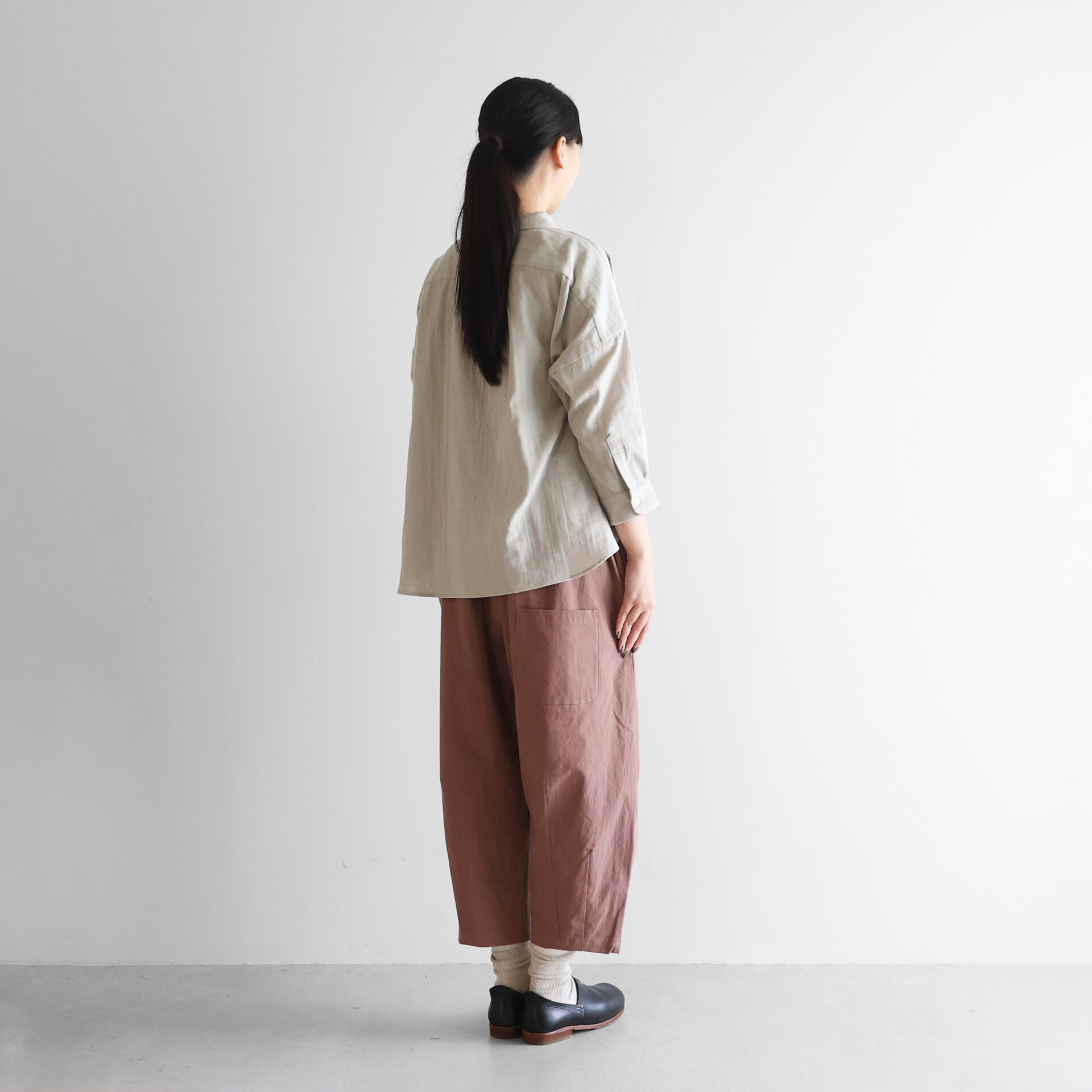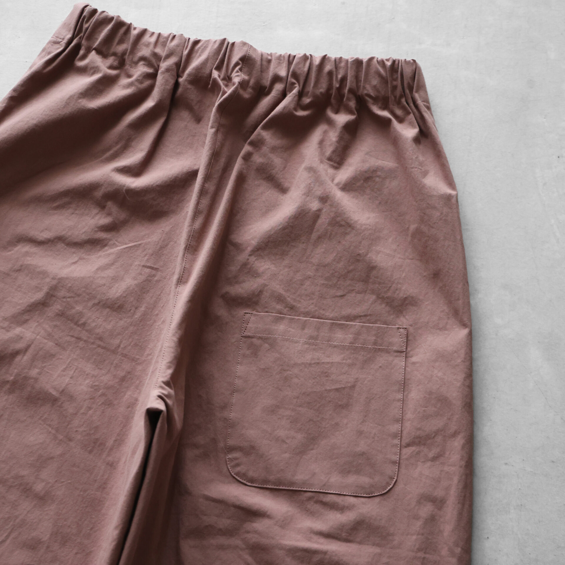 もも周りにたっぷりと生地を使用したバルーンパンツで、裾に向けてテーパードがかかったきれいなラインのシルエットです。8〜9分丈くらいの丈感で、少しロールアップして履いていただくのもおすすめです。右後ろについた下がり気味のポケットがポイント。