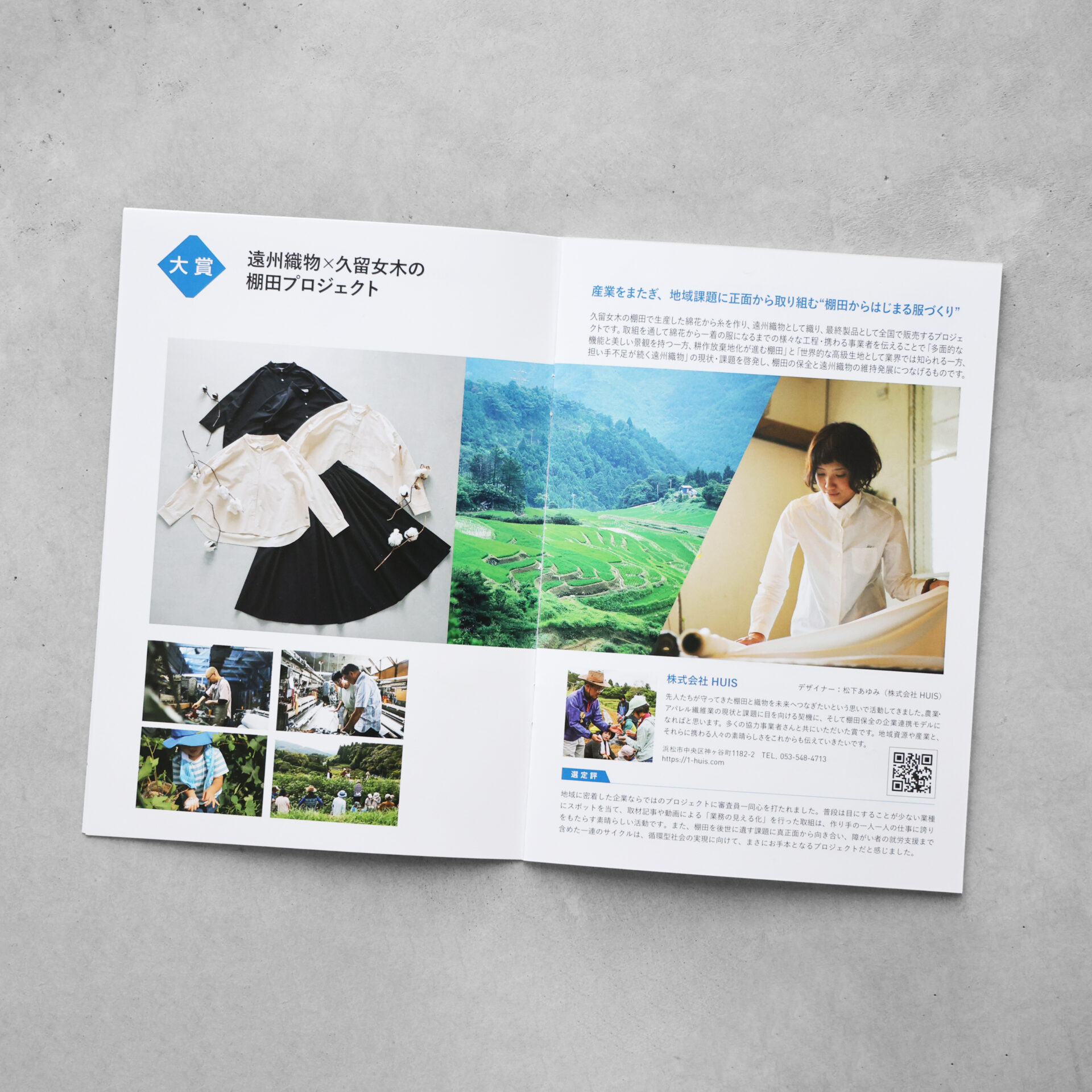 大賞(最高位賞)を受賞した「”遠州織物×久留女木の棚田”プロジェクト」は、棚田の耕作放棄地を活用した綿花栽培からはじまる洋服づくりを通して、作り手のつながりを伝え、地域産業の課題に向き合うプロジェクトです。