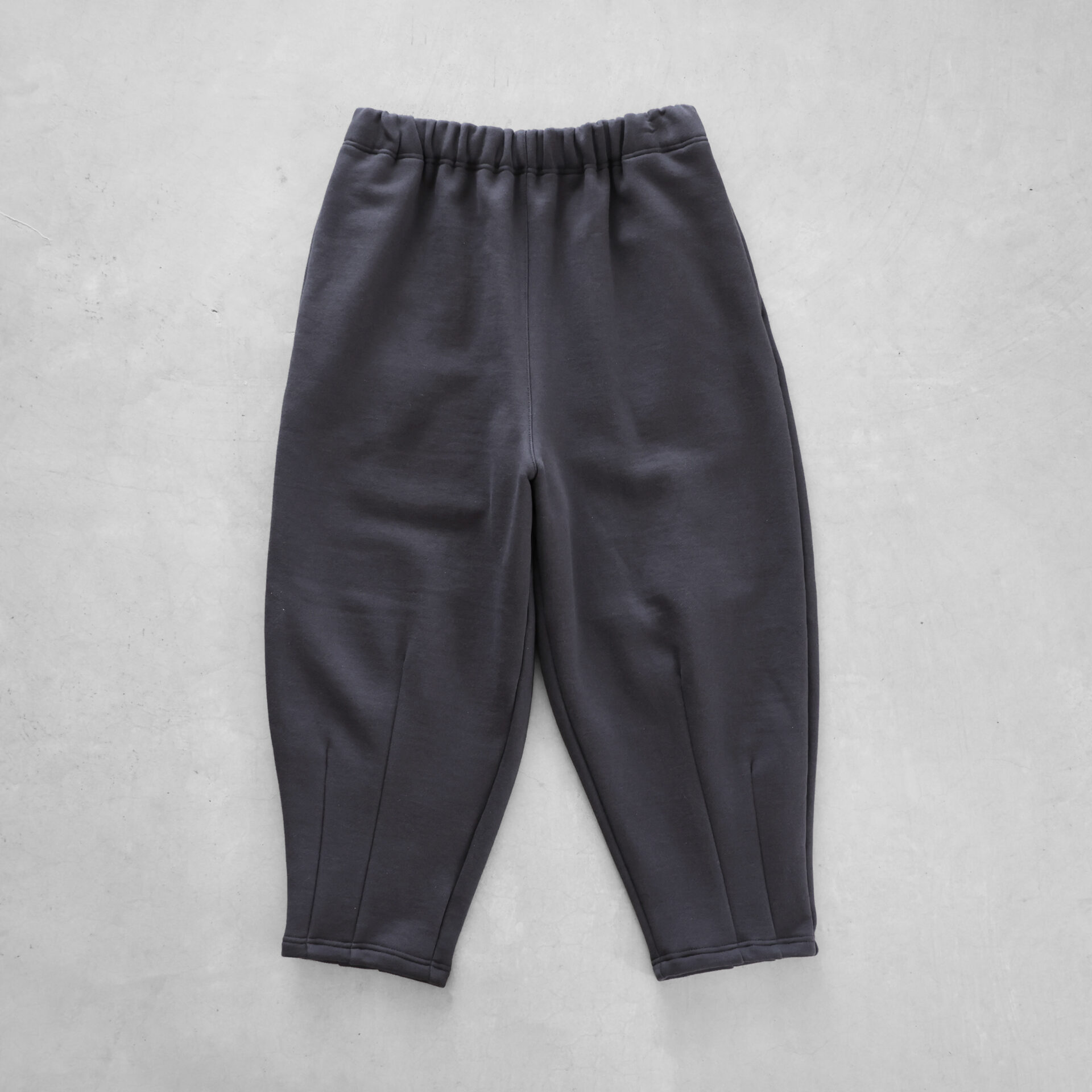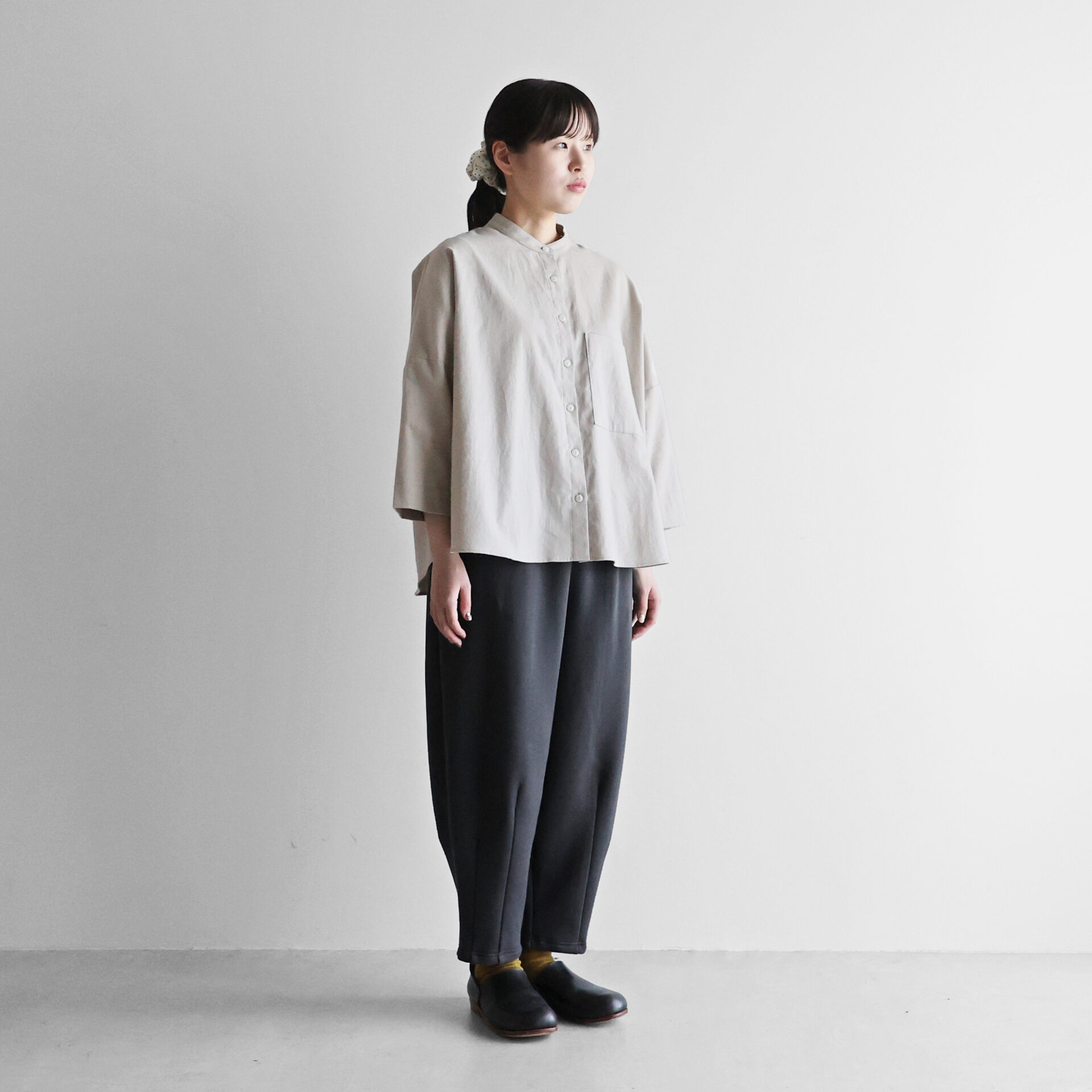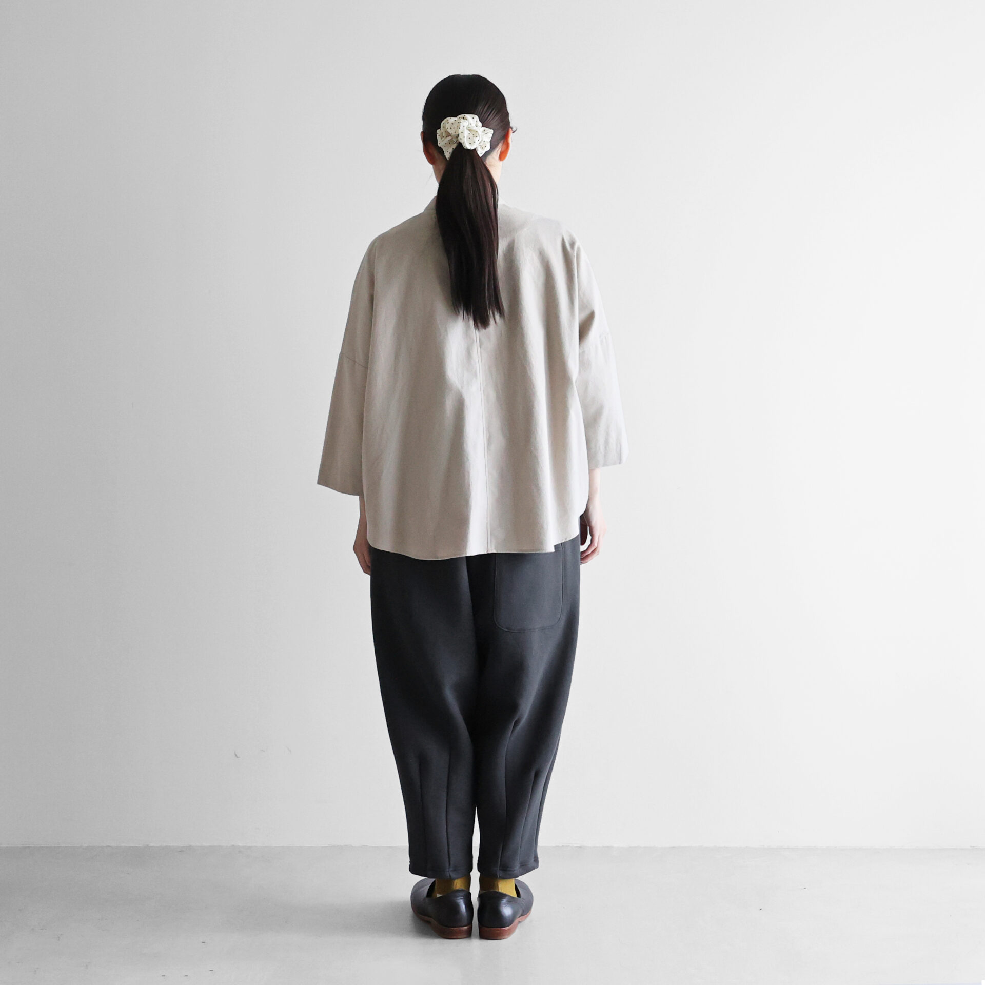 もも周りにたっぷりと生地を使用したバルーンパンツで、裾に向けてテーパードがかかったきれいなラインのシルエットです。8〜9分丈くらいの丈感で、少しロールアップして履いていただくのもおすすめです。右後ろについた下がり気味のポケットがポイント。