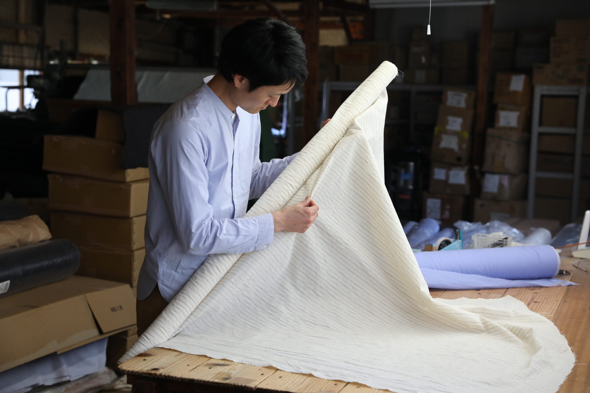 そんな超長綿から作られた極細糸を旧式のシャトル織機を使い、ゆっくりと織り上げているのがHUISの生地。