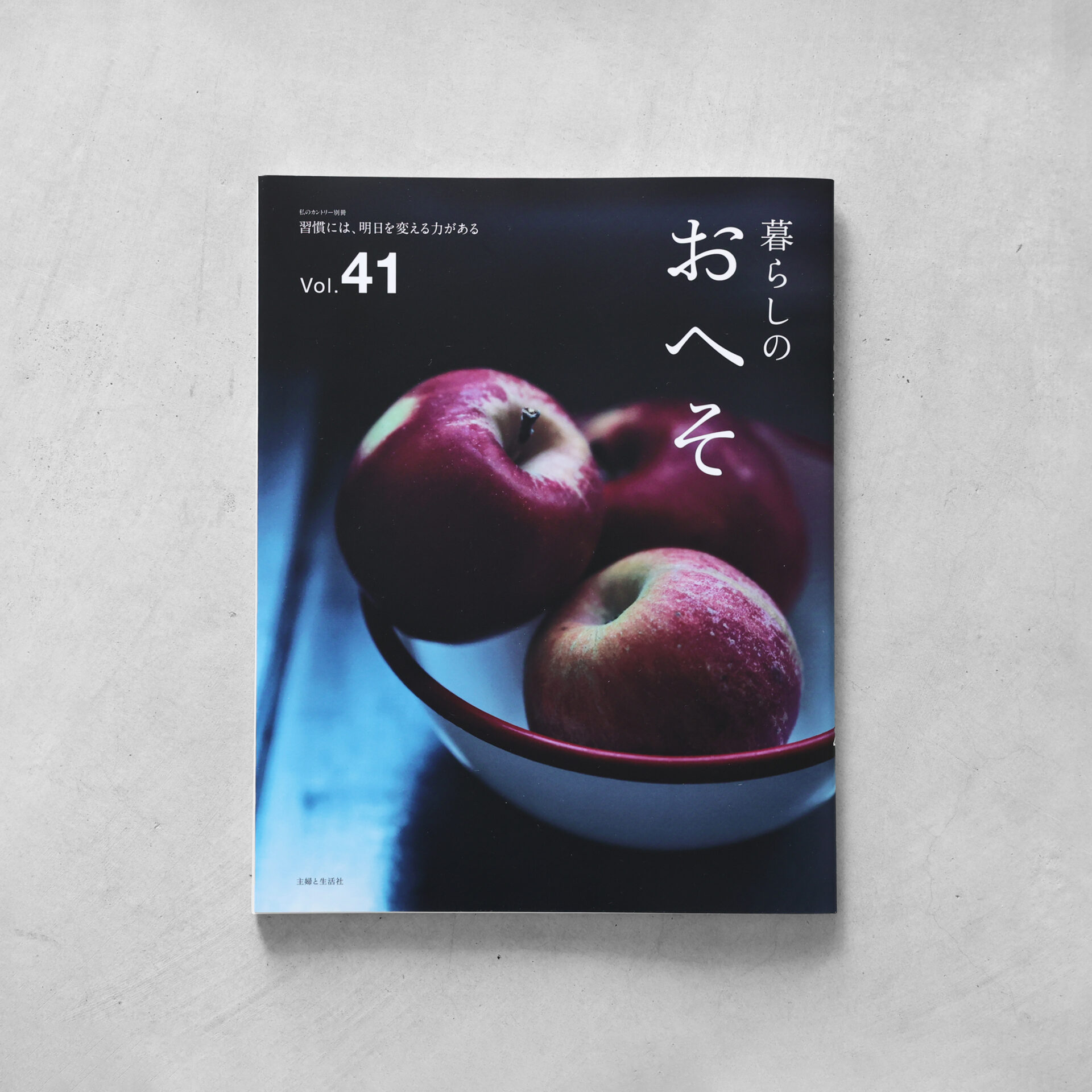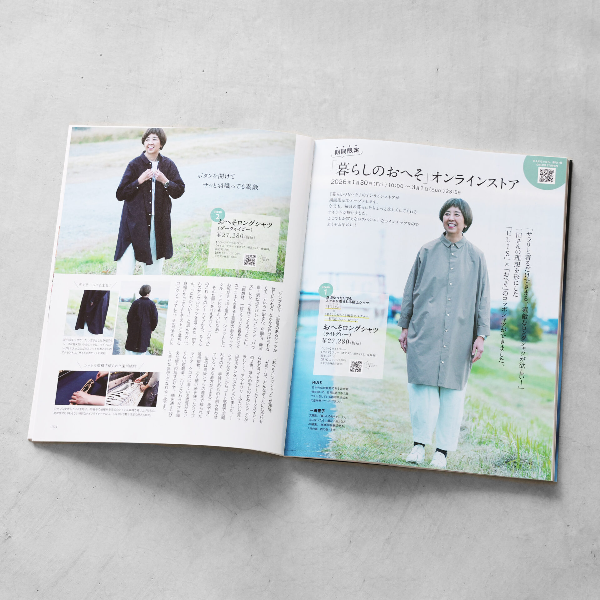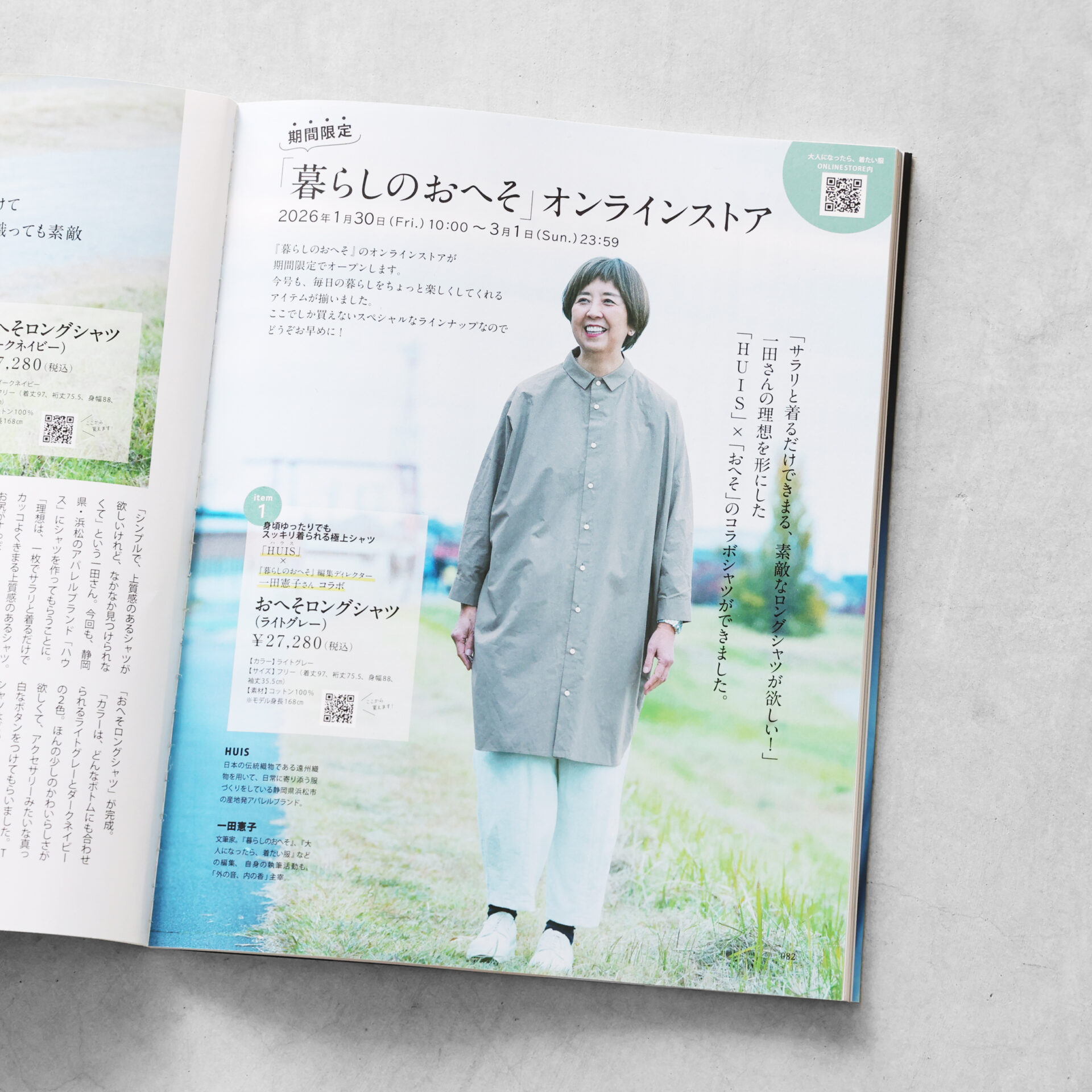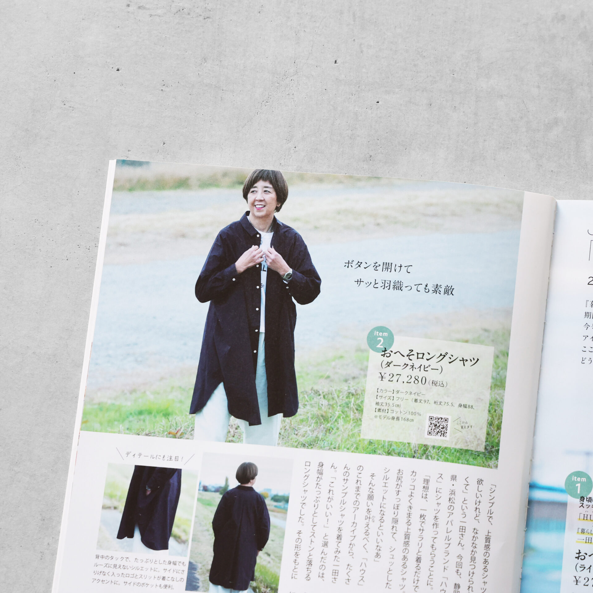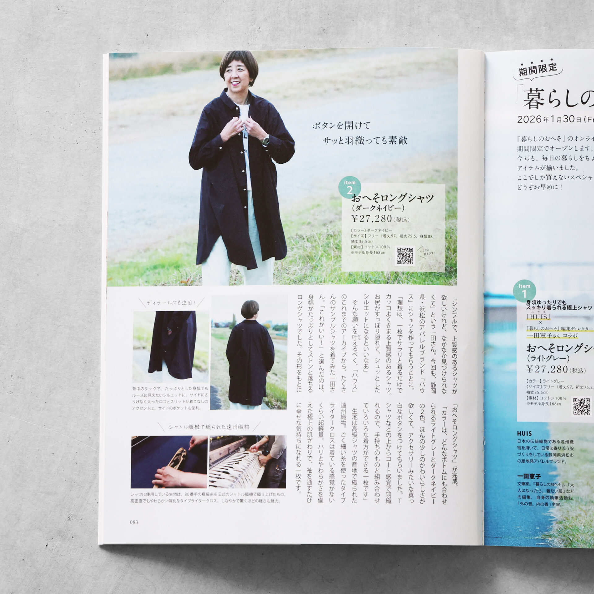 おいしそうな真っ赤なりんごが表紙の「暮らしのおへそ vol.41」(1/30発売)では、一田憲子さんとつくったコラボロングシャツをご紹介いただいています。