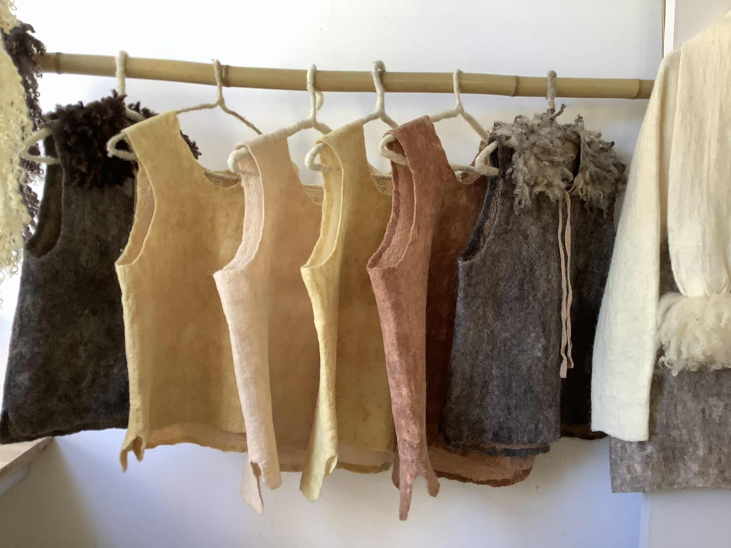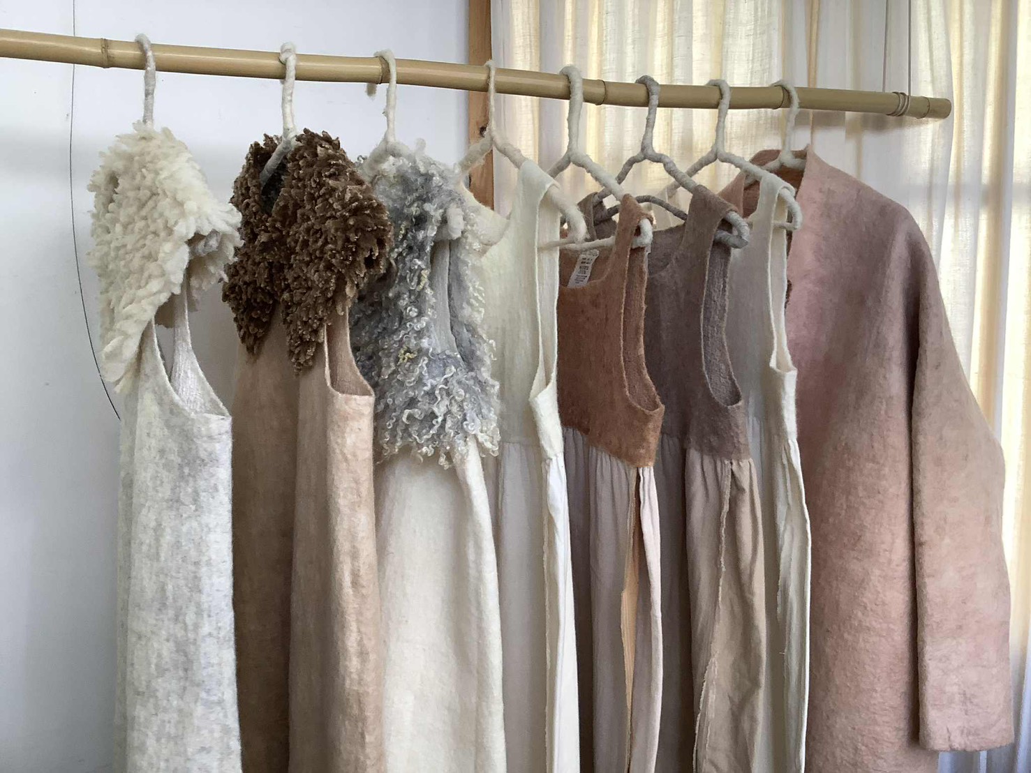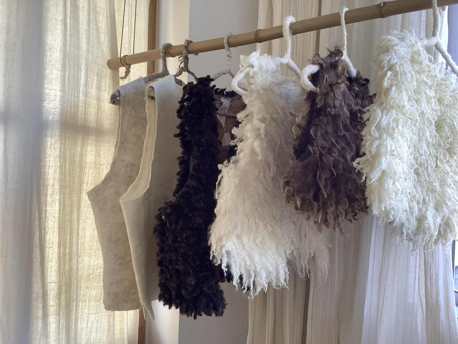 白樺内樹皮や玉ねぎなどを用いた草木染めの優しい色合いの羊服は、羽織るとふわりと軽く、温かみがじんわり伝わるものばかり。