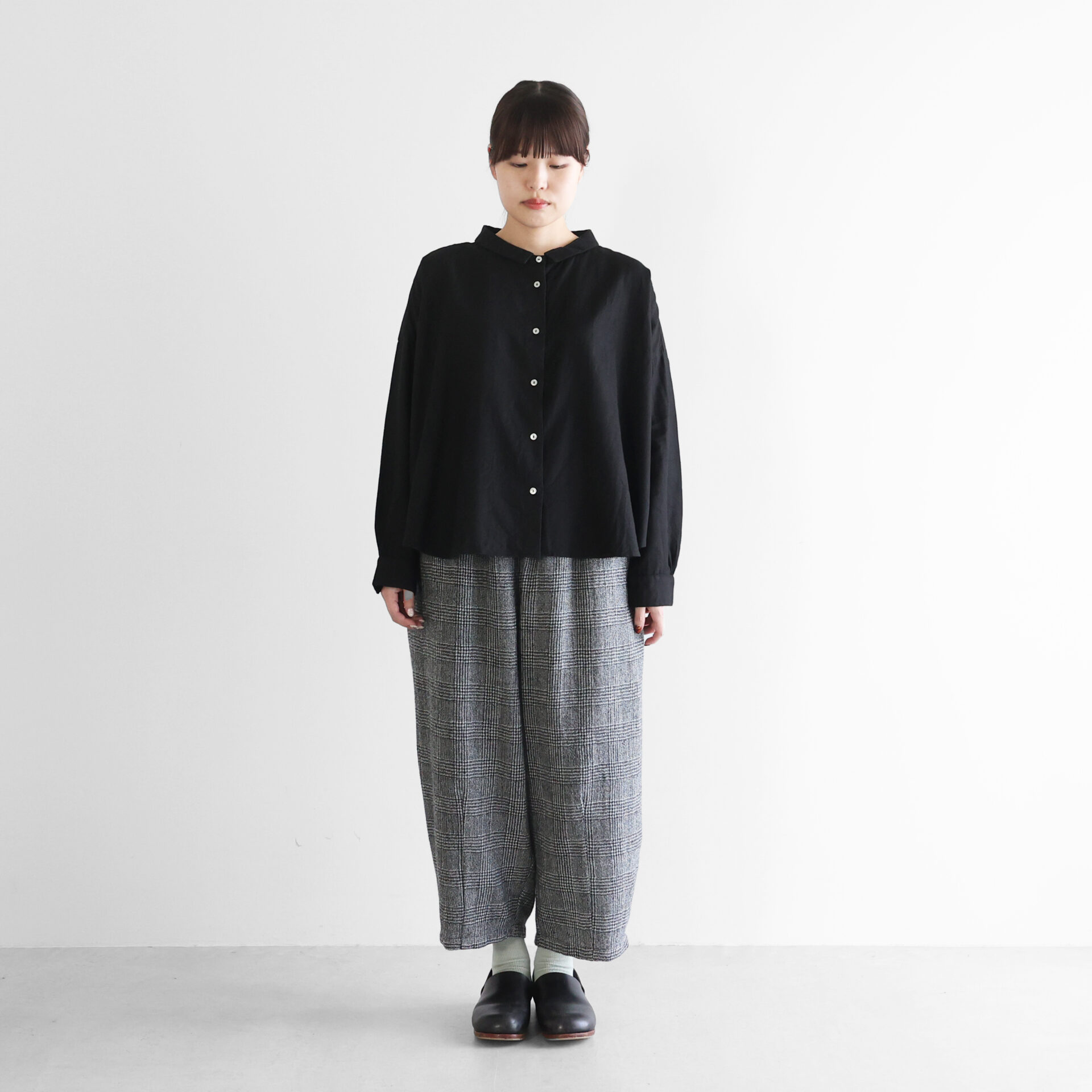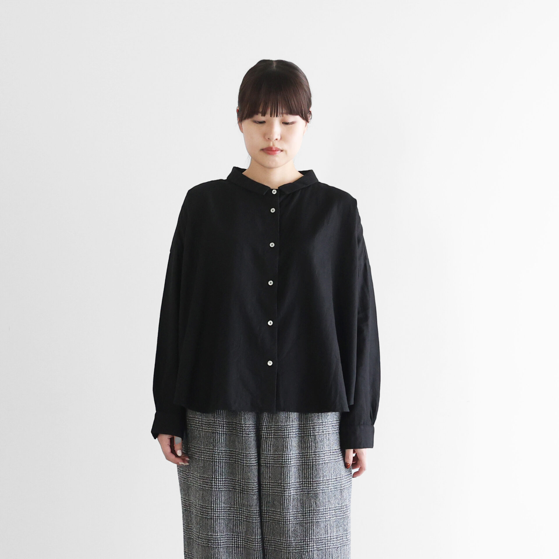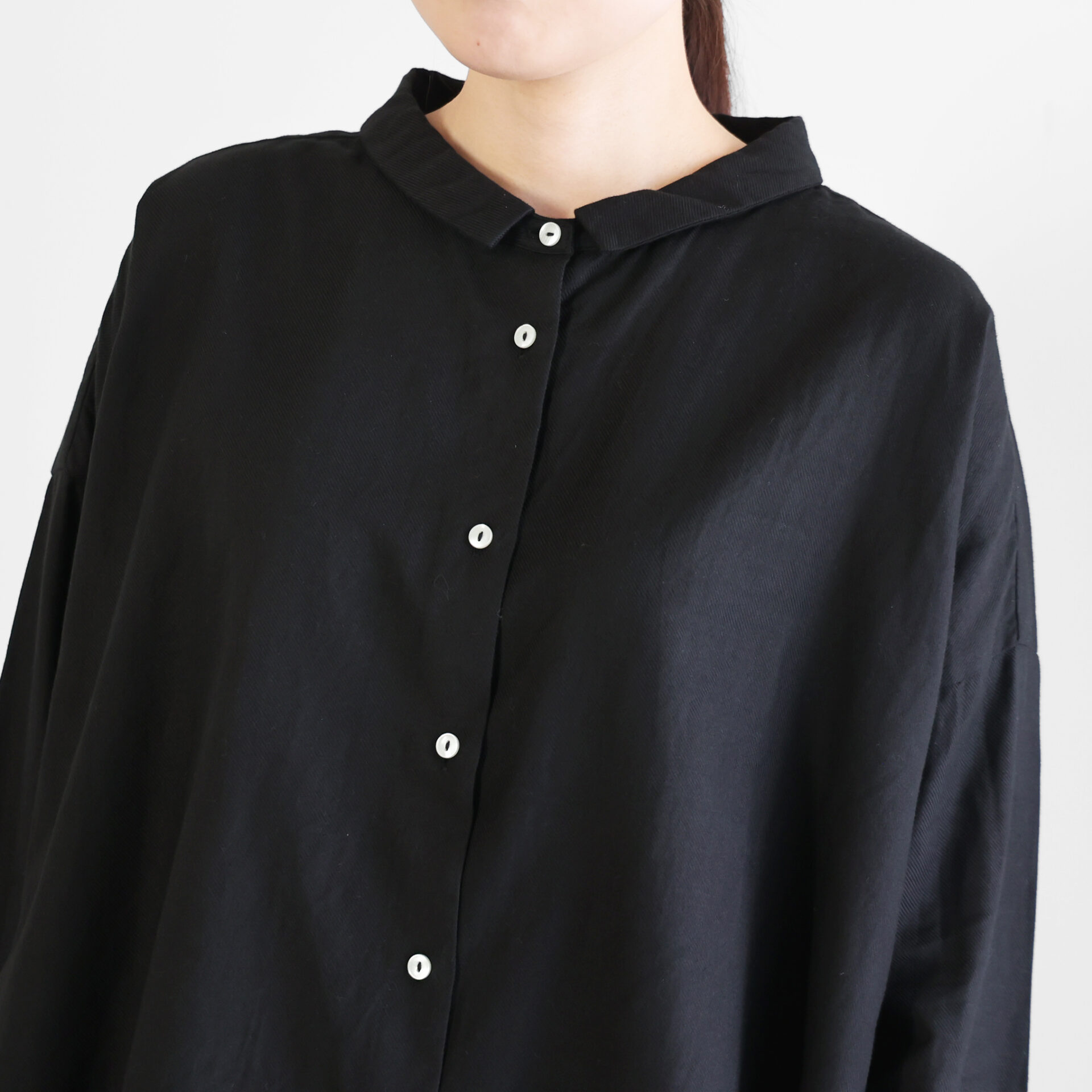 デザインは、身幅を大きくとったワイドシルエットのブラウスに仕上げ、肩の落ちる自然なAラインが生まれることで、スッキリとした印象のシルエットで着ていただけます。