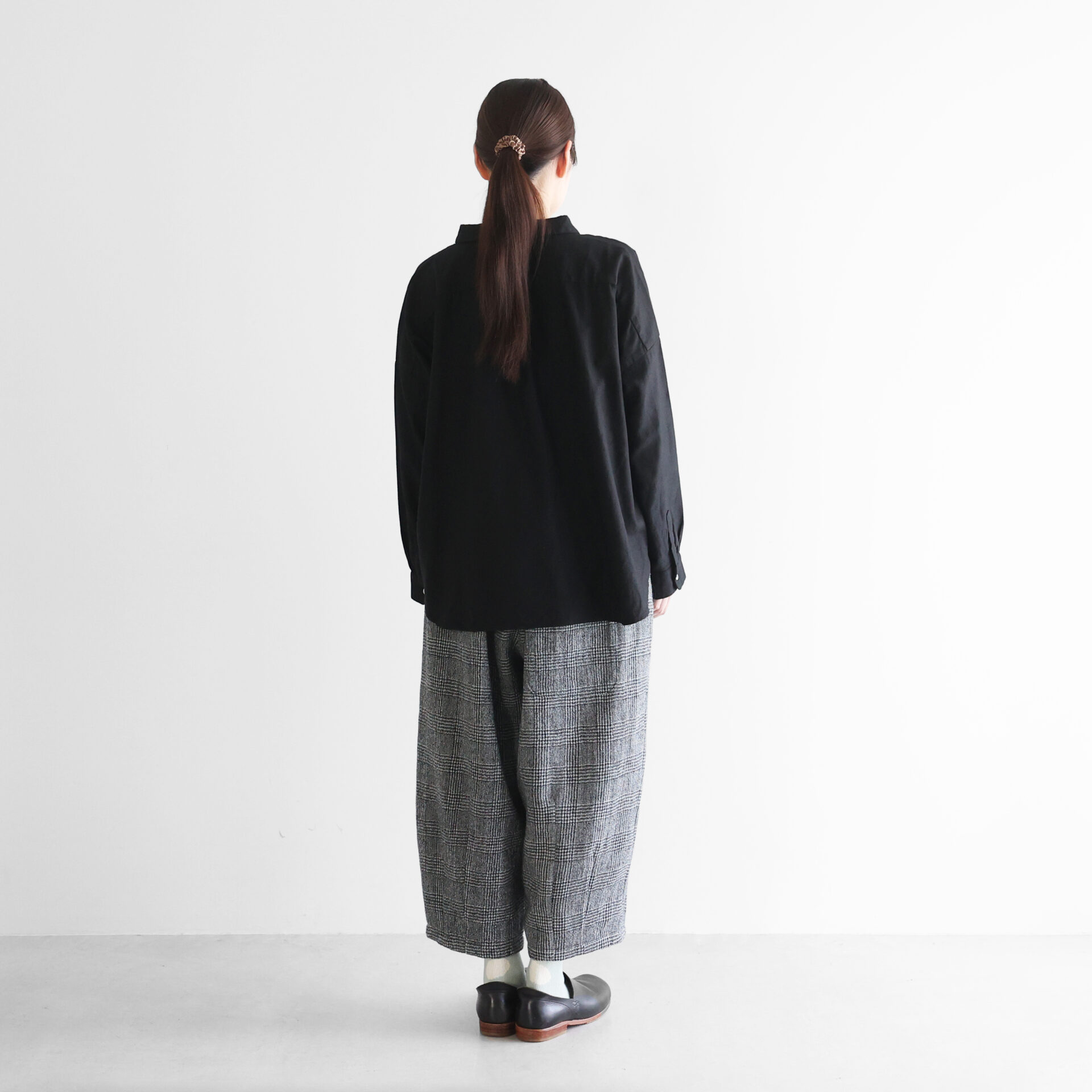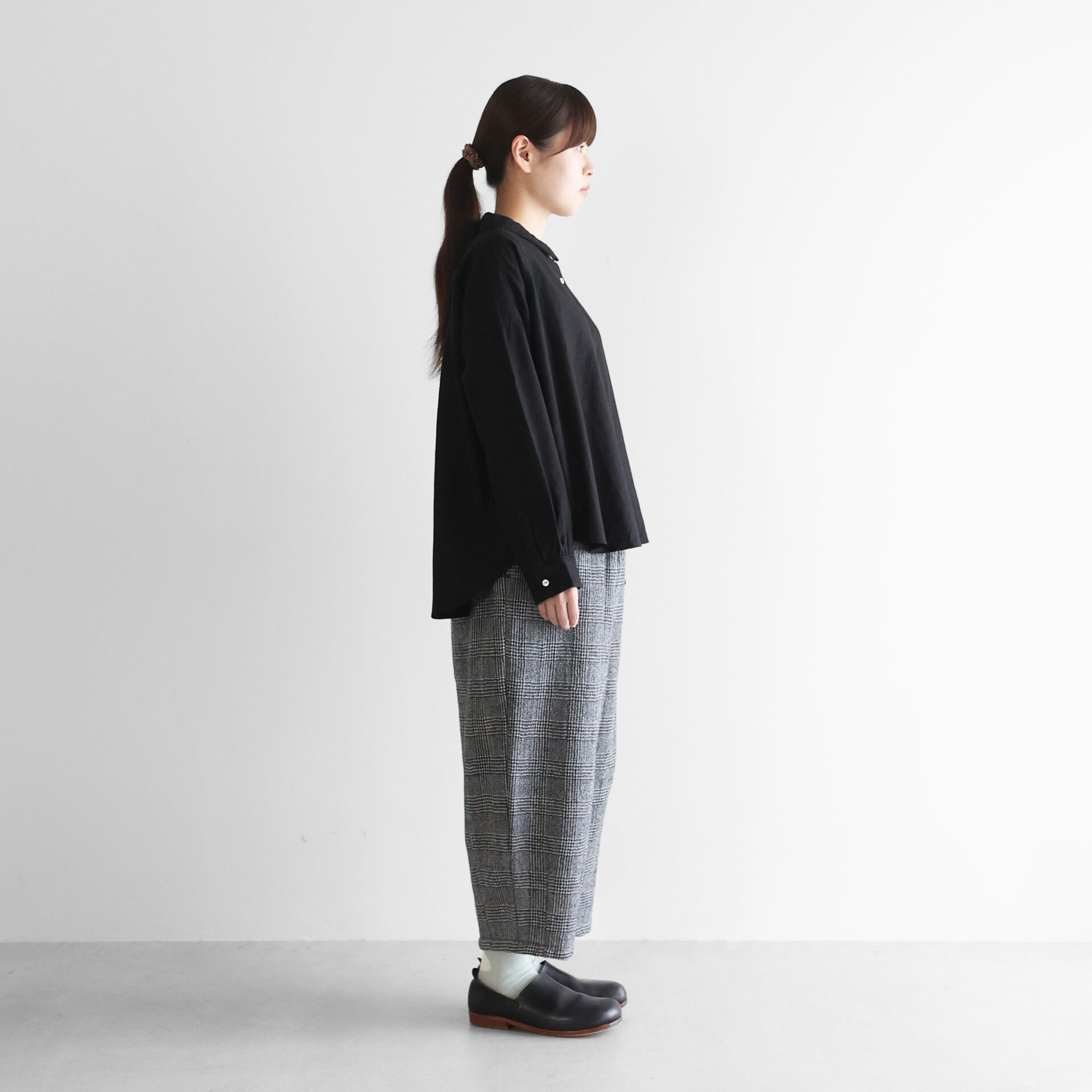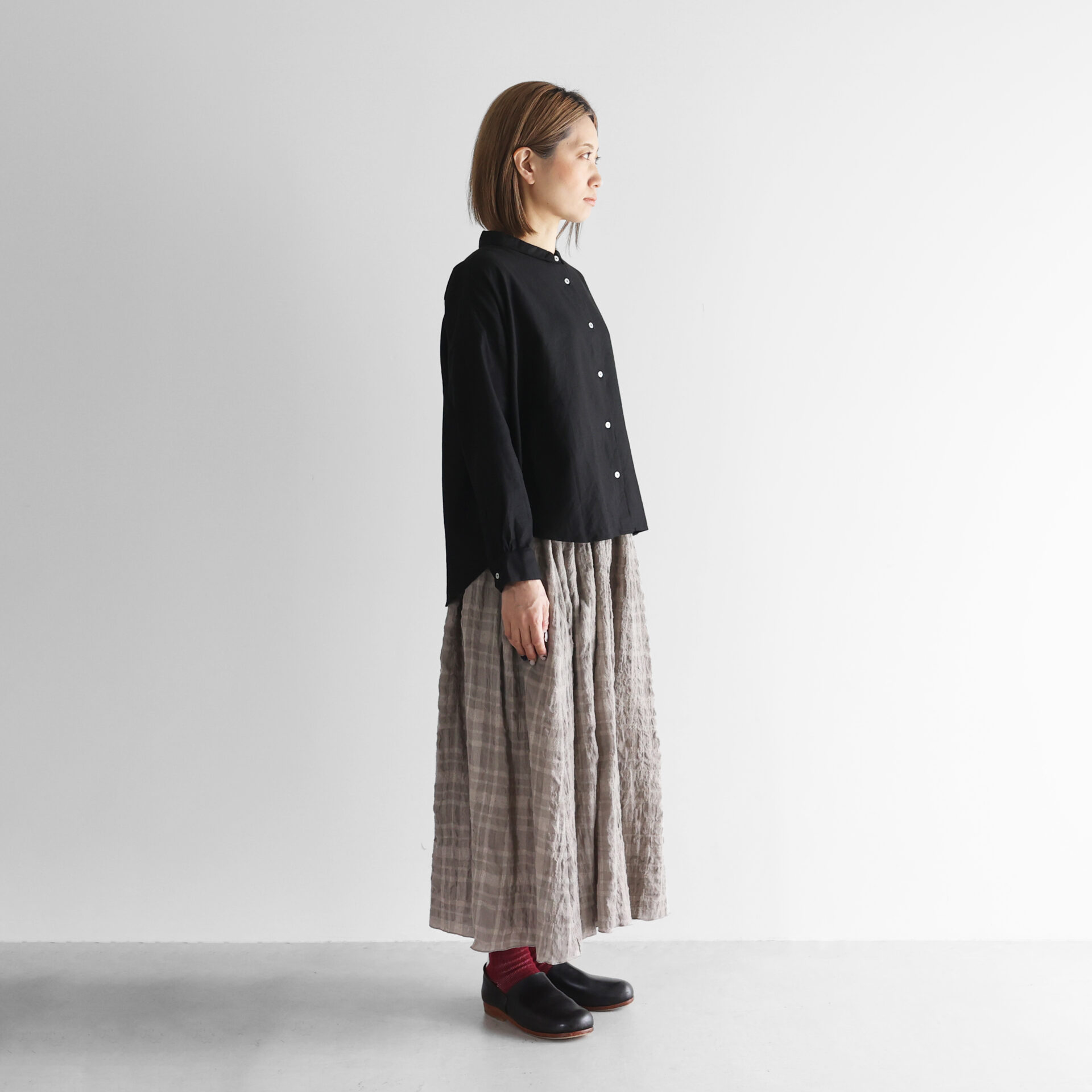 デザインは、身幅を大きくとったワイドシルエットのブラウスに仕上げ、肩の落ちる自然なAラインが生まれることで、スッキリとした印象のシルエットで着ていただけます。