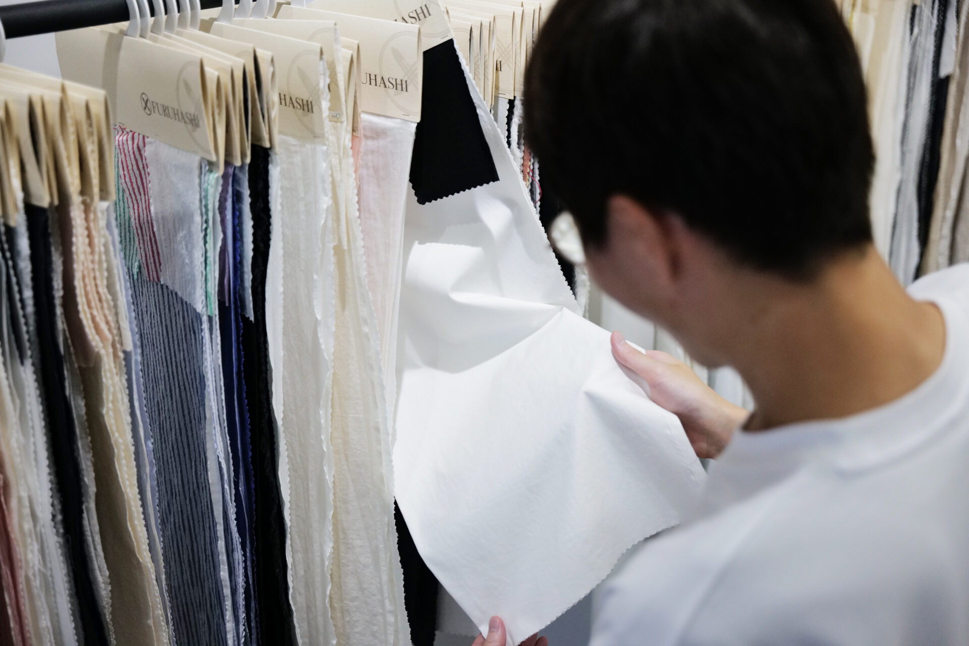 古橋織布には200品番の生地がある。30年かけてブランドとの対話から生まれた、それぞれ違う個性を持つ生地たち。肌触りも光沢も厚みも風合いも全部違う。しかも、これはまだ古橋織布だけの話。遠州にはそれぞれの機屋が、それぞれの得意分野を磨いている。古橋織布の200品番、そして他の機屋の生地も合わせれば、選択肢は何倍にも広がる。きっと誰にでも「推し」が見つかるということ。自分なりの理由で、自分だけの一着を選べるということだ。そうやって探す過程も含めて、新しい服との付き合い方だと思う。安さや手軽さだけじゃない、自分なりの理由で選ぶ。そうすることで、一着一着を、より大切に着るようになる。