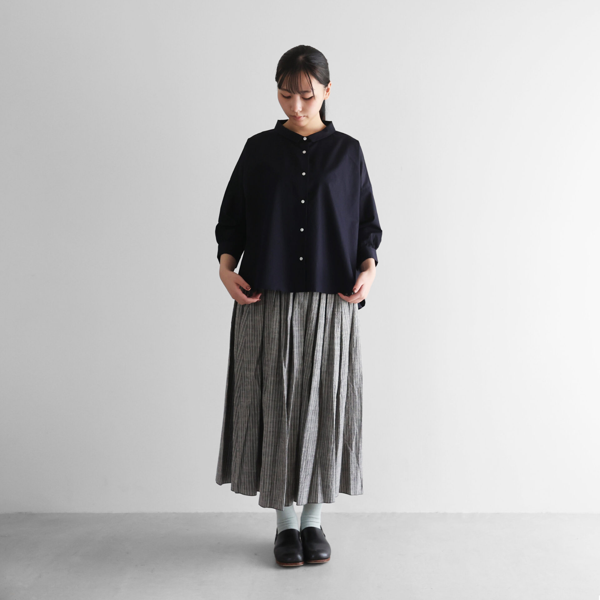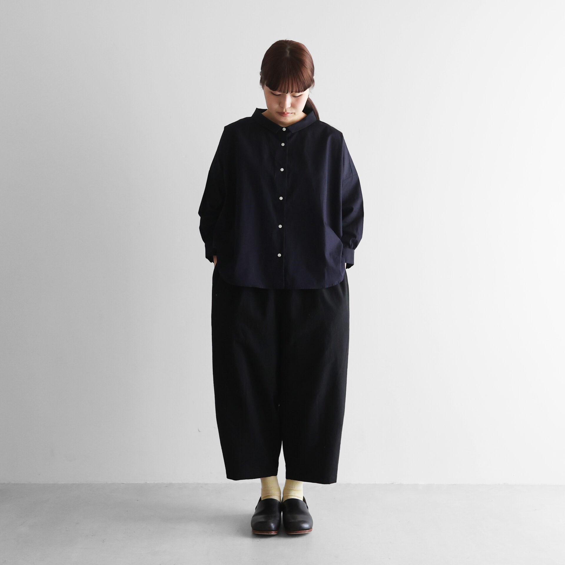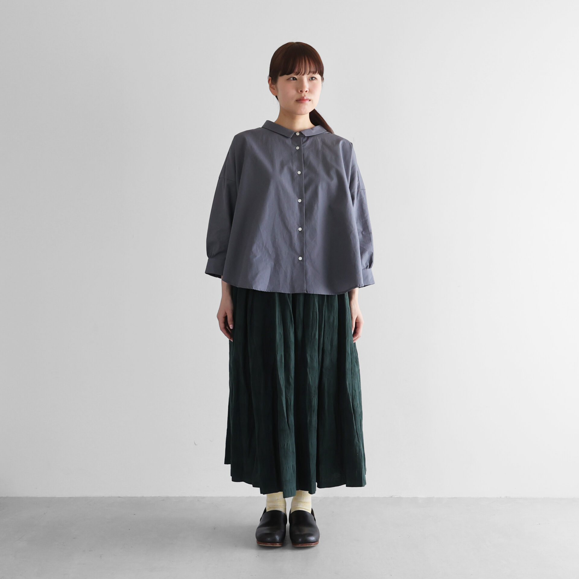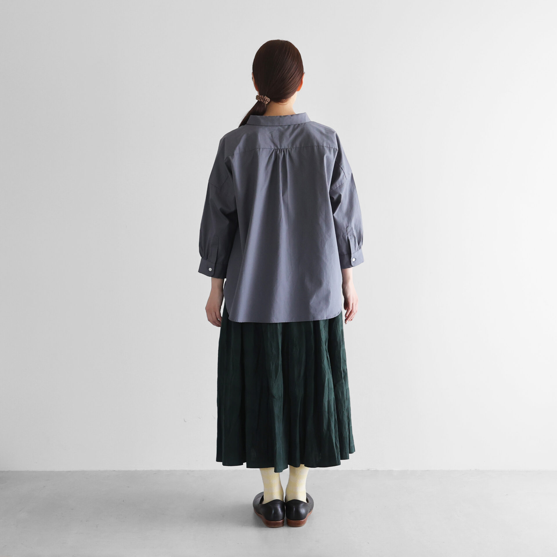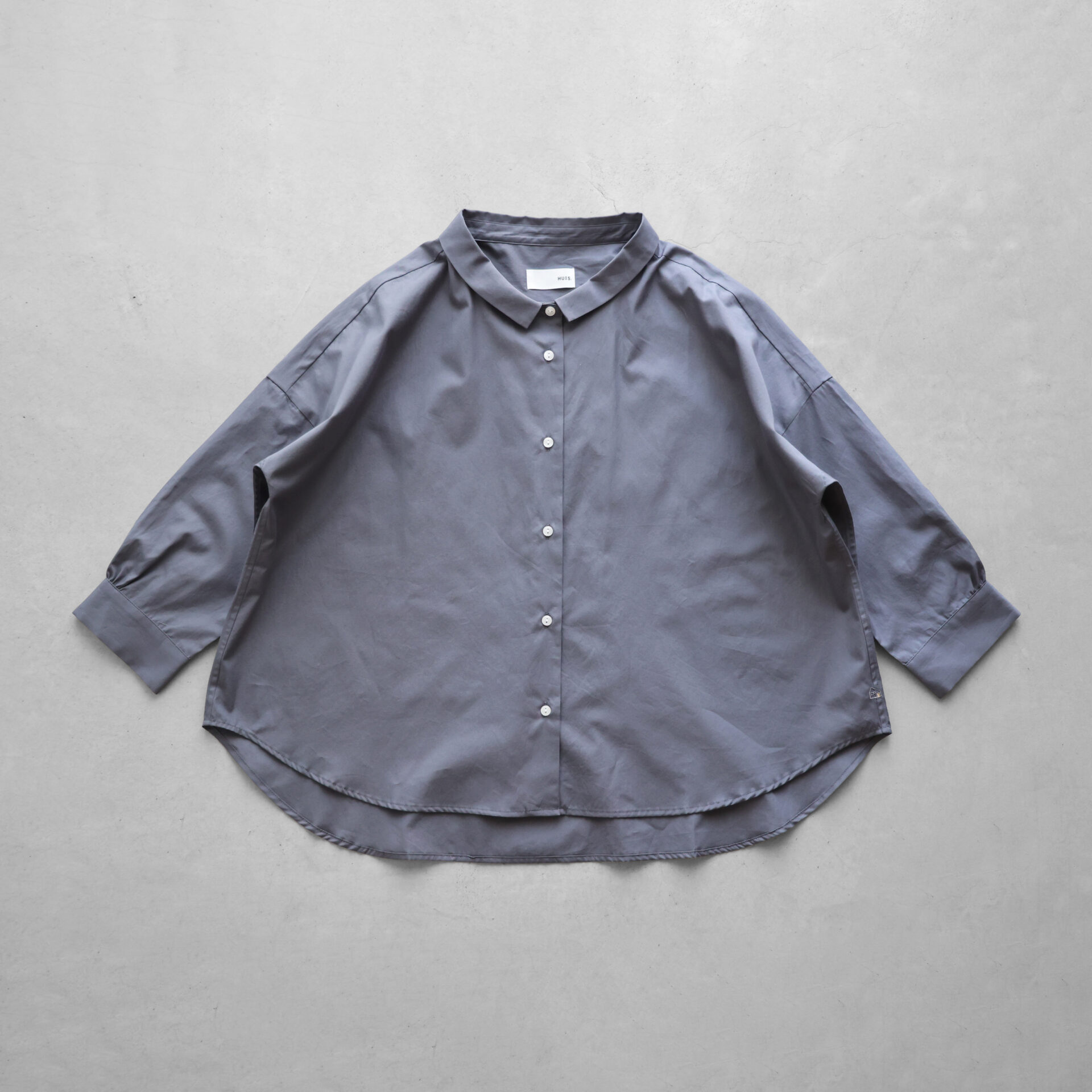 デザインは、身幅を大きくとったワイドシルエットのブラウスに仕上げ、肩の落ちる自然なAラインが生まれることで、スッキリとした印象のシルエットで着ていただけます。
