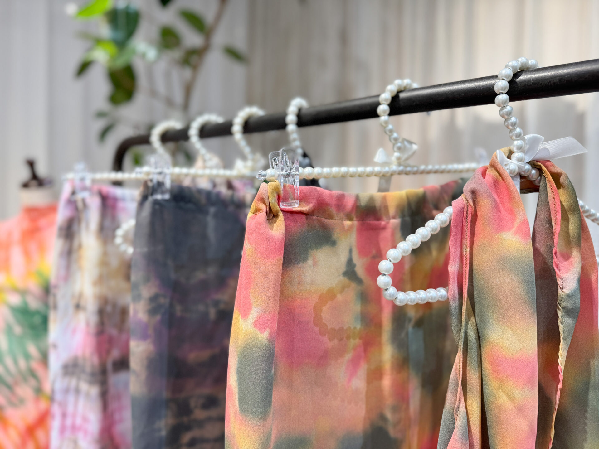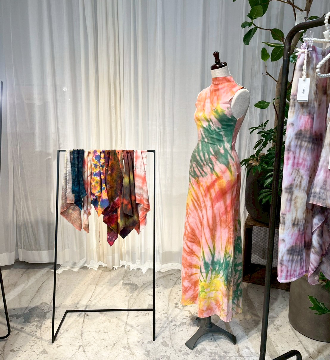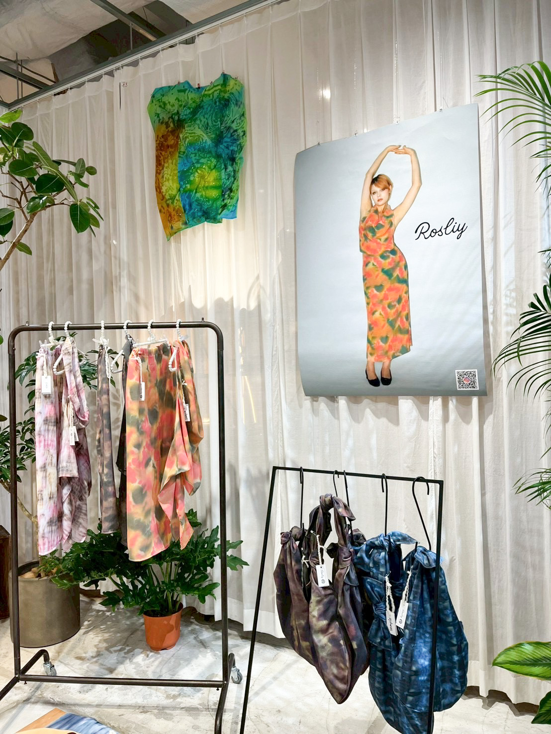 rosliy (ロザリー)は、、文化服装学院ファッションテキスタイル科の清水さんが手がけるブランドで、手染めやデジタルプリント、捺染プリントなど、多彩な技法から生まれるオリジナルテキスタイルをもとに、服や小物を制作されています。