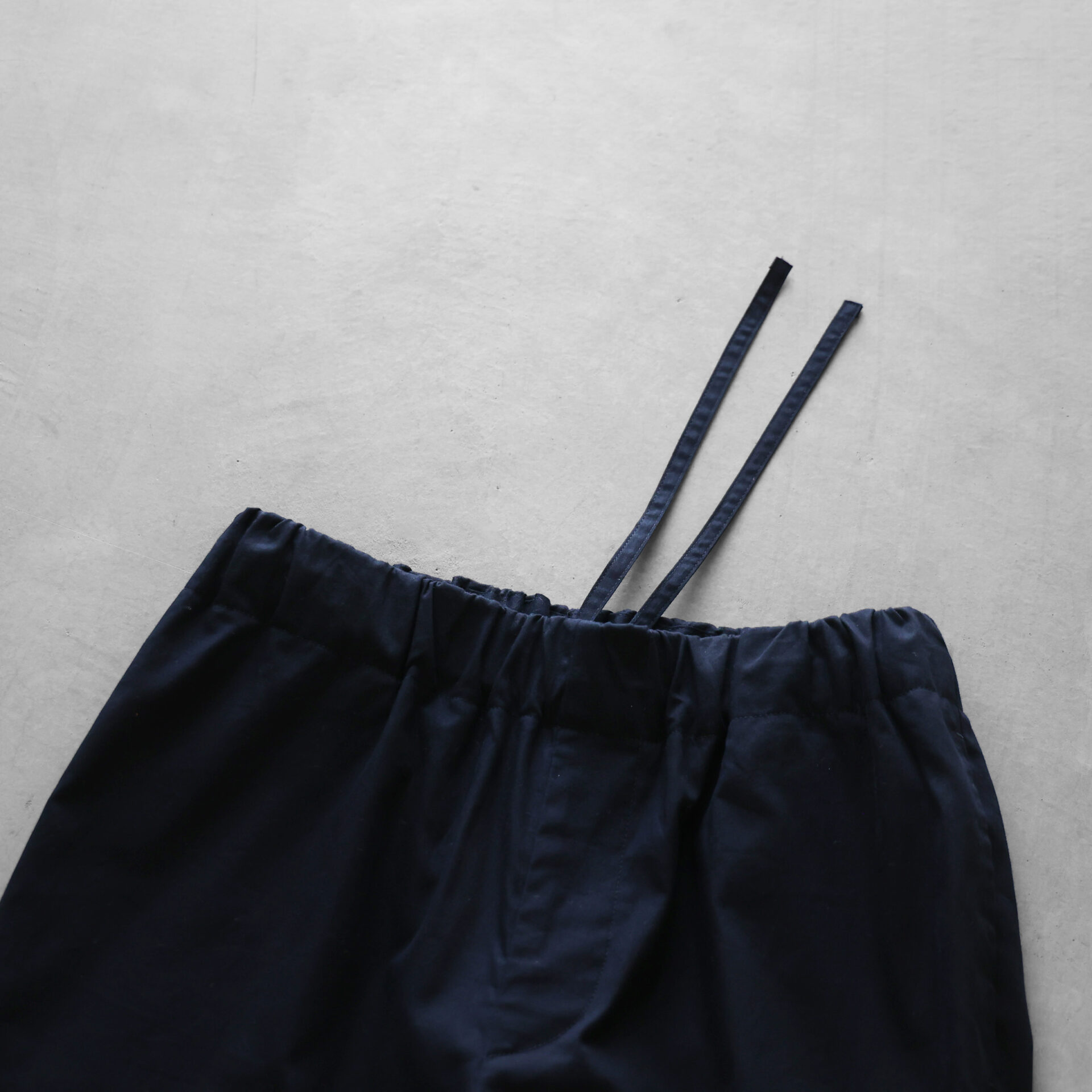 ウエストからもも周りにかけてはゆったりとしたサイズ感ではき心地がよく、裾にかけてテーパードがかかることですっきりとしたシルエットが生まれます。少しロールアップしてはいていただくのもおすすめです。ウエストはゴムと紐で調節が可能ですので、どなたでも快適にはいていただくことができます。