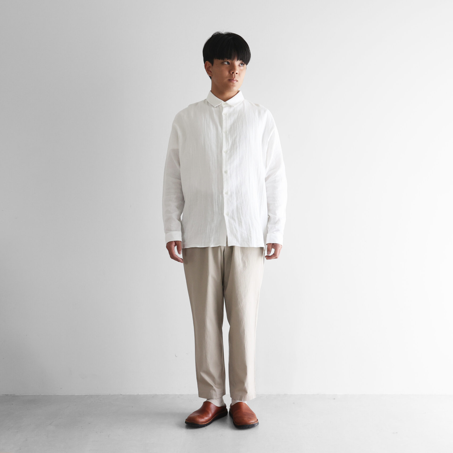 40番手単糸を引揃えて平織りすることで、しっかりとした質感と軽やか&やわらかな肌触りが共存する特別な生地で、使い込むほどに味わいが増します。