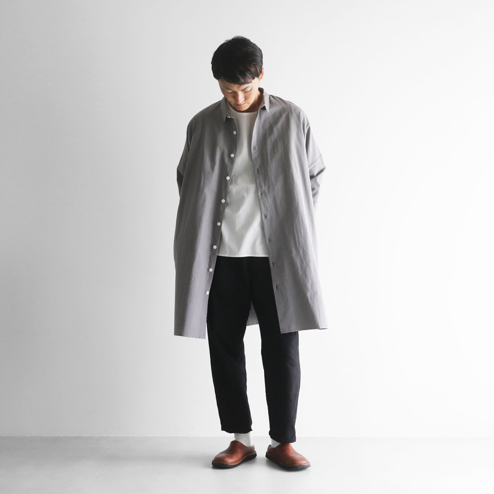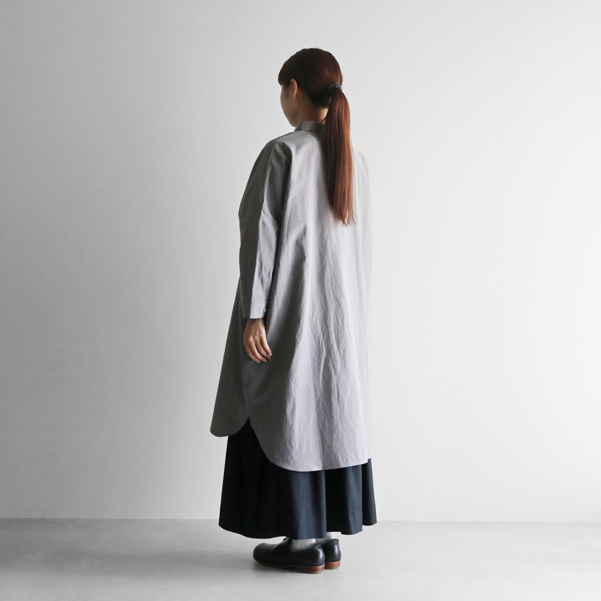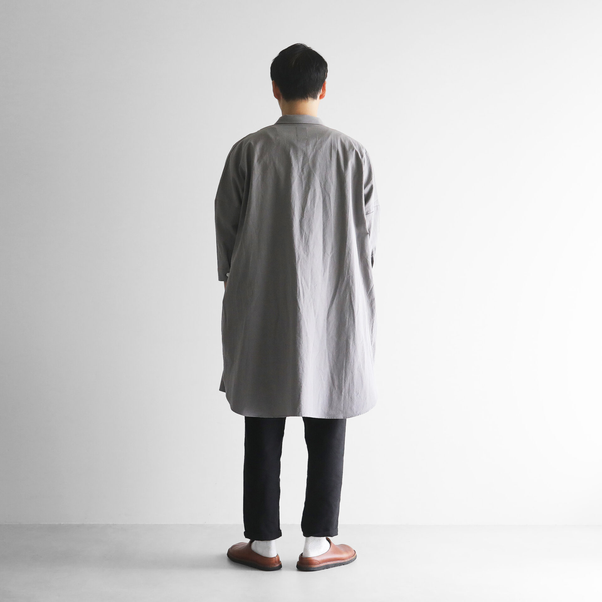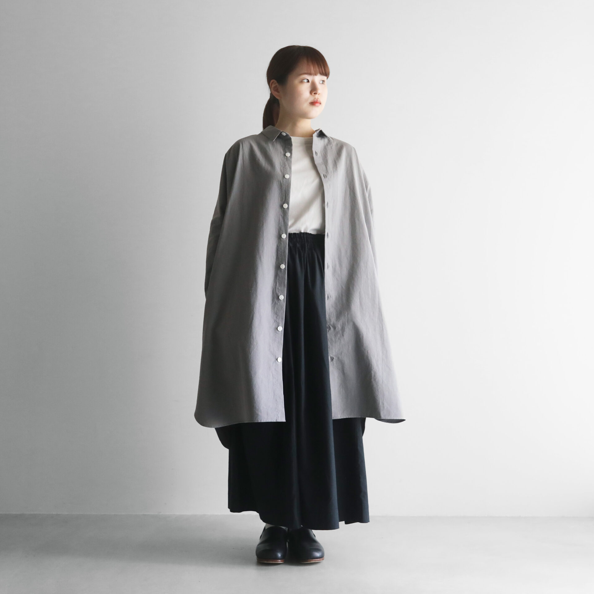 デザインは、身幅をたっぷりととったオーバーサイズのロングシャツで、どなたでもしっくりと馴染むサイズ感。アウター感覚で羽織って着ていただくこともできます。