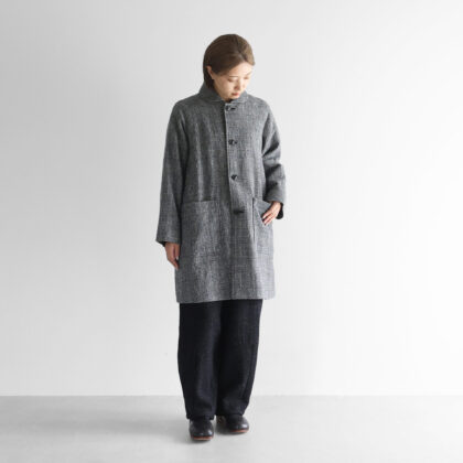 素材は、ウール 100%。48 番⼿梳⽑双⽷を、空気を含むよう特に低密度で⽢く柔らかく織ったうえで強い縮絨加⼯をかけることにより、⽣地に凹凸...