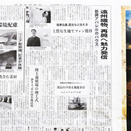 11/7(金)日経新聞・静岡経済面にて、「遠州織物、再興へ魅力発信」というタイトルとともにHUISのこれまでの取り組みと遠州織物について大き...